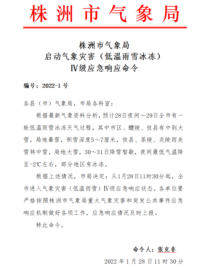 气象局启动气象灾害(低温雨雪冰冻)Ⅳ级应急响应