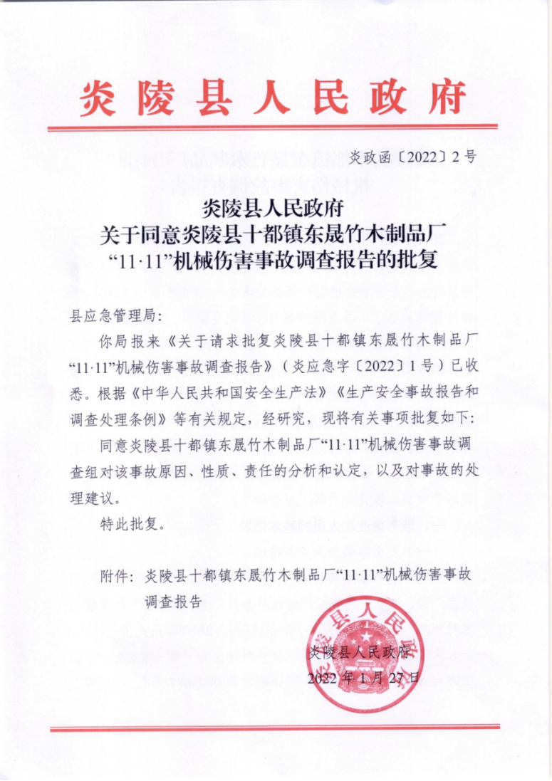关于同意炎陵县十都镇东晟竹木制品厂“11·11”机械伤害事故调查报告的批复