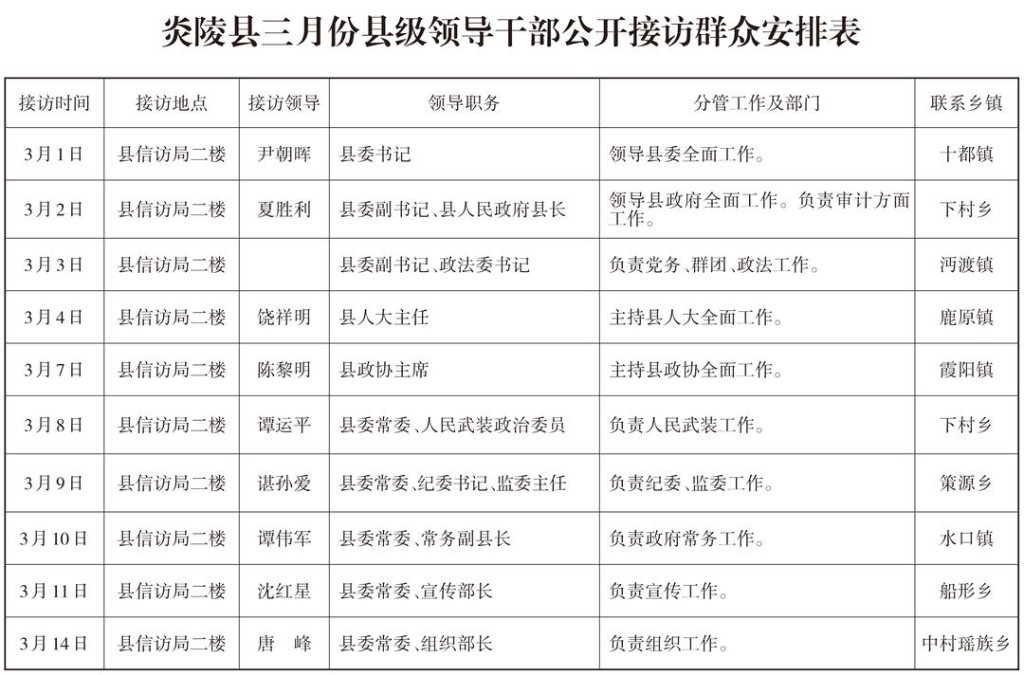 关于2022年3月份炎陵县县级领导公开接访群众的安排公告