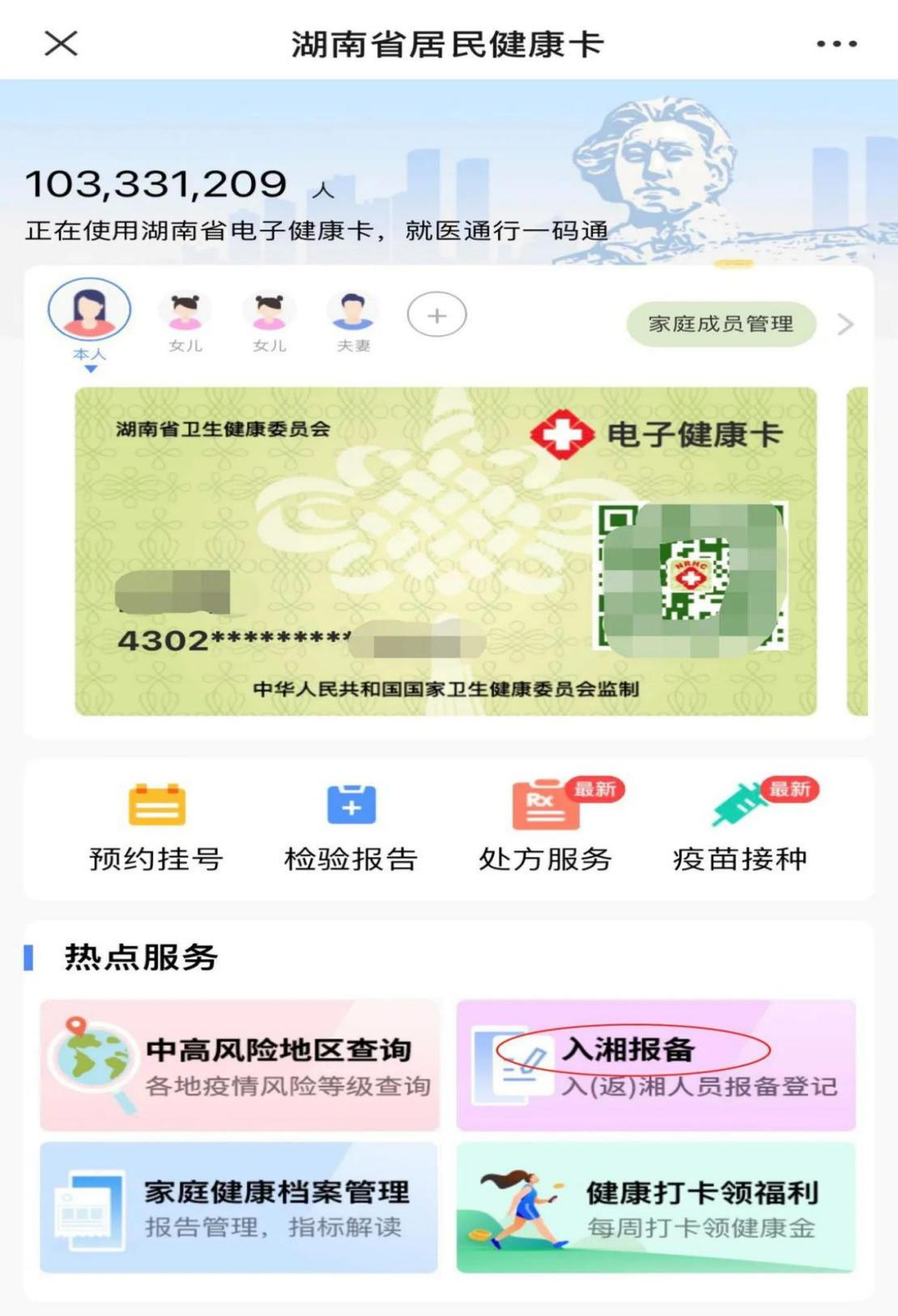点击湖南省居民健康卡内“入湘报备”