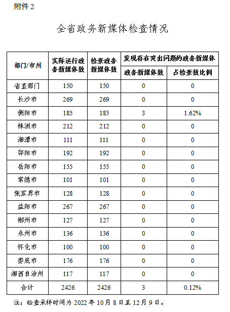 2022年第四季度,省政务局组织对全省正常运行的619家政府网站进行了全覆盖检查,无存在单项否决问题网站,总体合格率100%。对全省正常运行的2426家政务新媒体进行了普查,发现3家存在突出问题,总体合格率99.88%。长沙市、株洲市、湘潭市、邵阳市、岳阳市、常德市、张家界市、益阳市、郴州市、永州市、怀化市、娄底市、湘西自治州政府网站和政务新媒体检查合格率均达到100%。