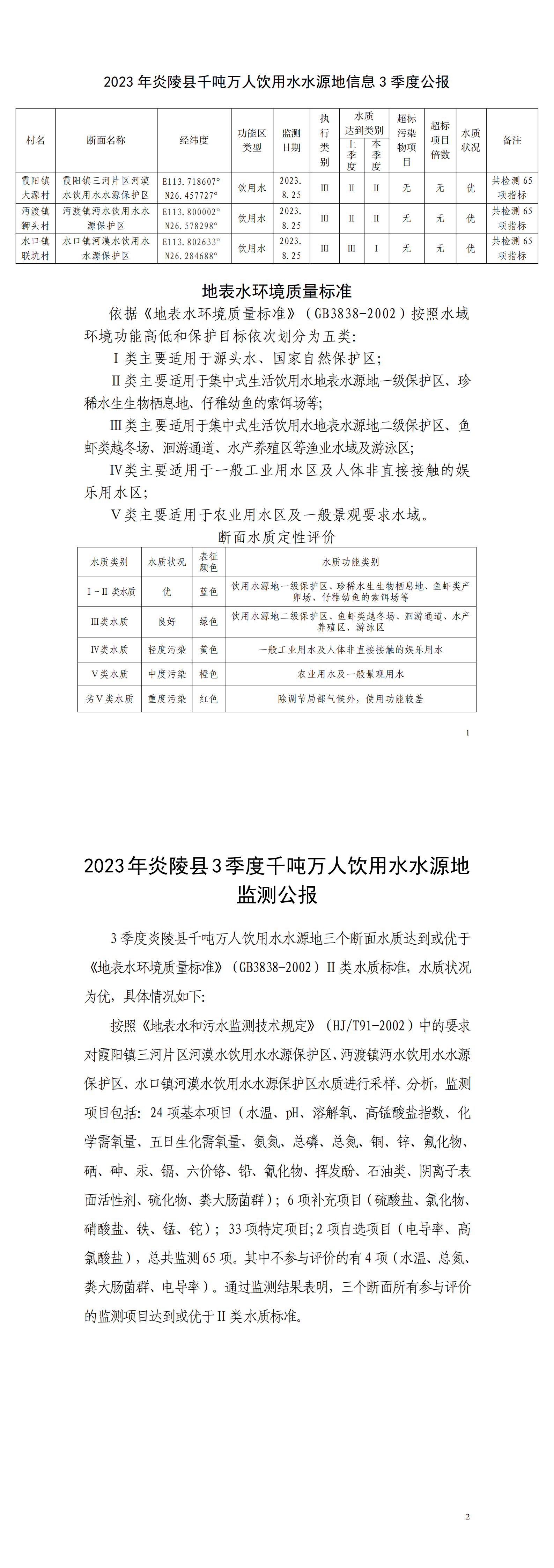附件:2023年炎陵县千吨万人饮用水水源地信息3季度公报