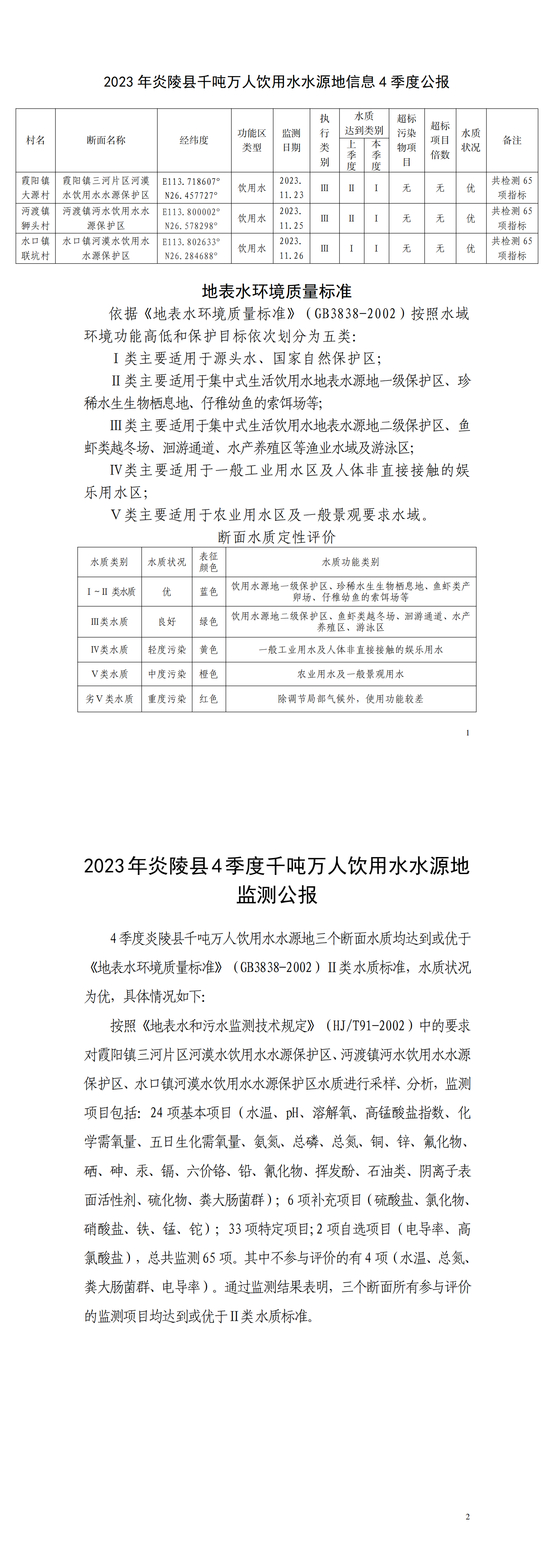 2023年炎陵县千吨万人饮用水水源地信息4季度公报