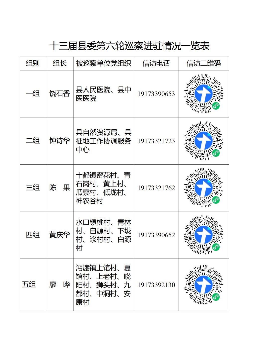 根据县委和县委巡察工作领导小组统一部署,十三届县委第六轮巡察由2个县委巡察组对县人民医院、中医医院、自然资源局、征地工作协调服务中心4个县直单位党组织及其下辖二级机构党组织开展常规巡察,由3个县委巡察组对沔渡镇、十都镇、水口镇下辖20个村级党组织开展专项巡察。6月20日至24日,5个巡察组全部完成进驻。