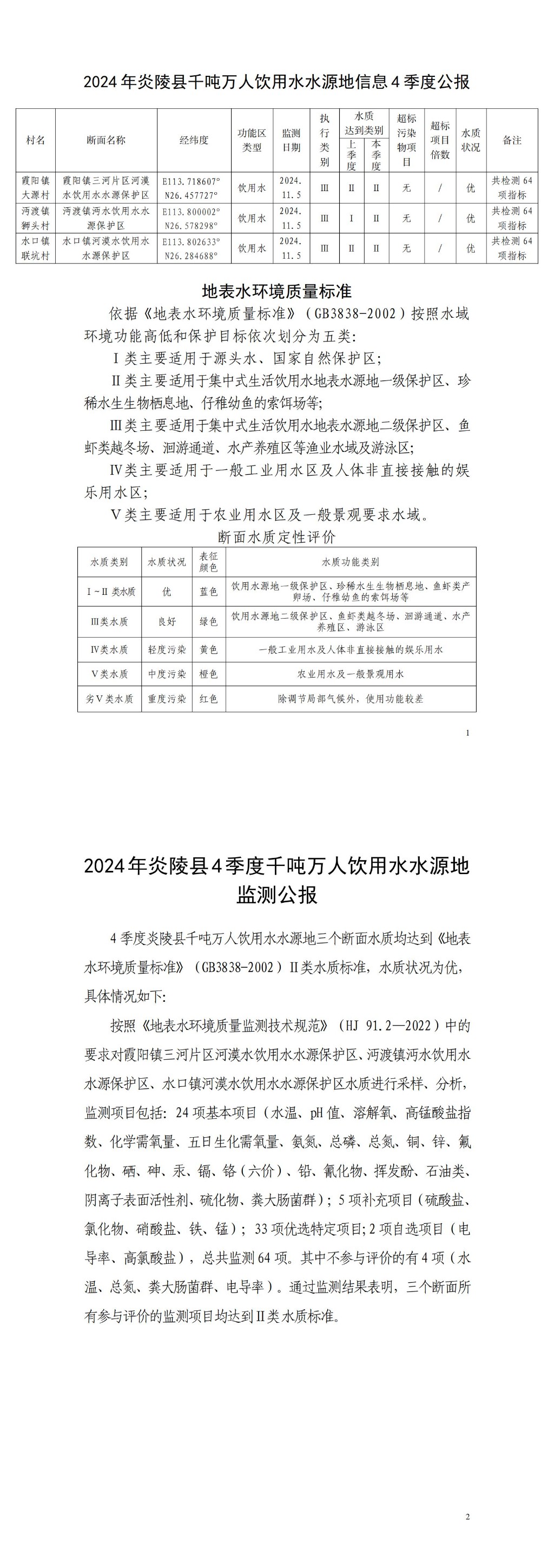 2024年炎陵县千吨万人饮用水水源地信息4季度公报