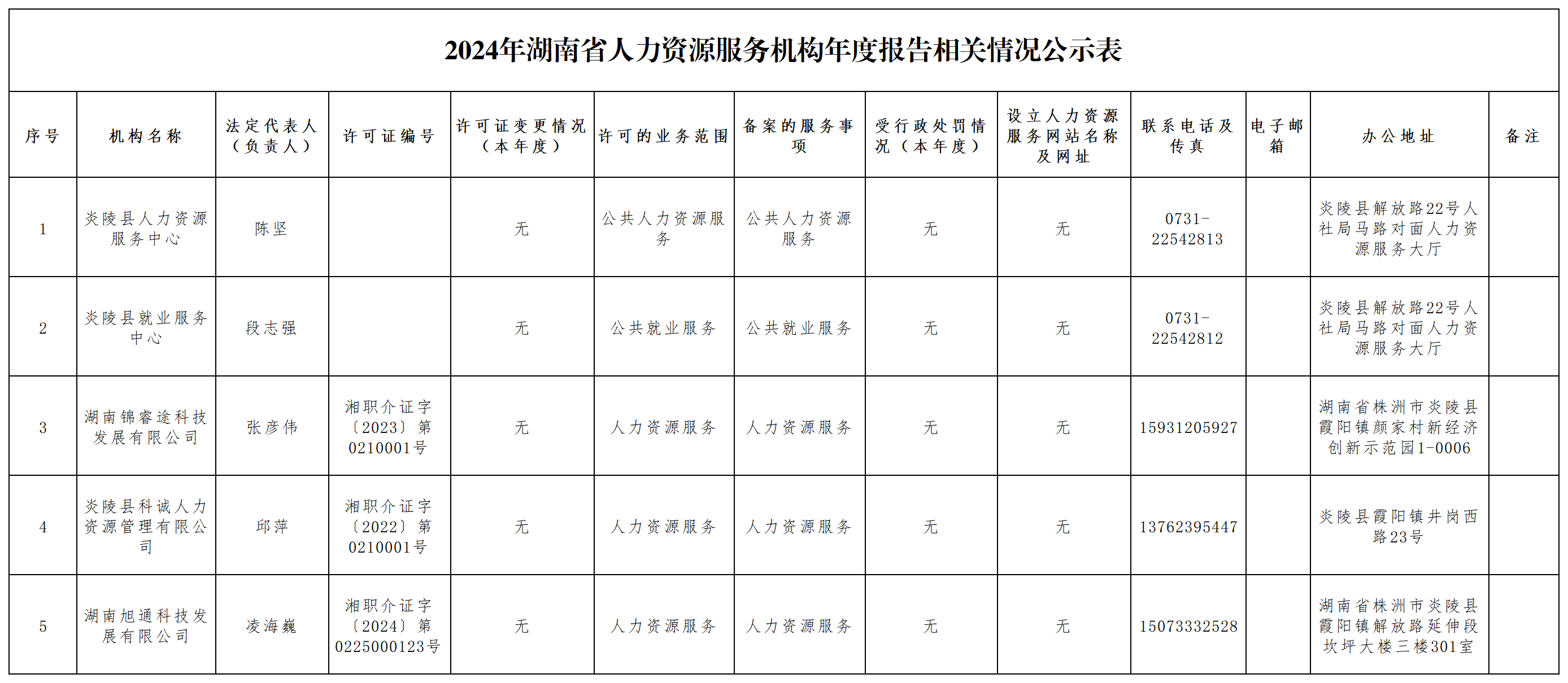 2024年度炎陵县辖区内有3家经营性人力资源服务机构,分别是:湖南锦睿途科技发展有限公司、炎陵县科诚人力资源管理有限公司、湖南旭通科技发展有限公司;2家公共人力资源服务机构,分别是:炎陵县就业服务中心、炎陵县人力资源服务中心。5家人力资源服务机构于2025年4月30日前自行完成2024年1月1日至2024年12月31日期间公示内容。