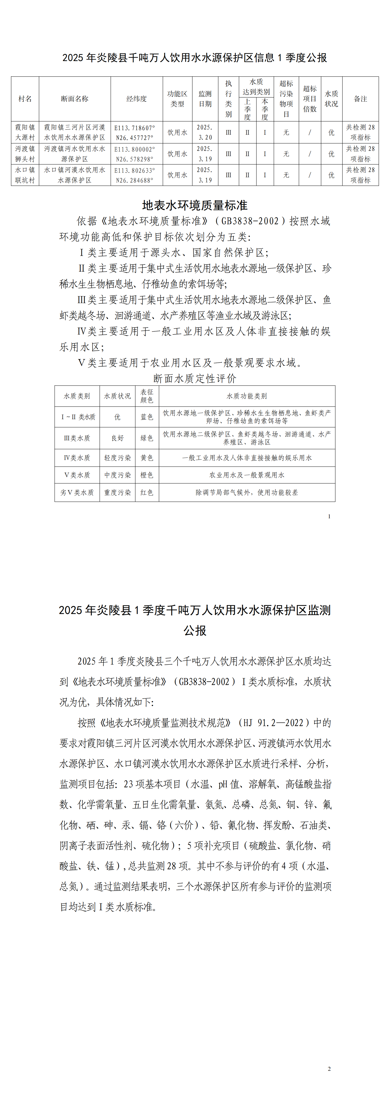 2025年炎陵县千吨万人饮用水水源保护区信息1季度公报