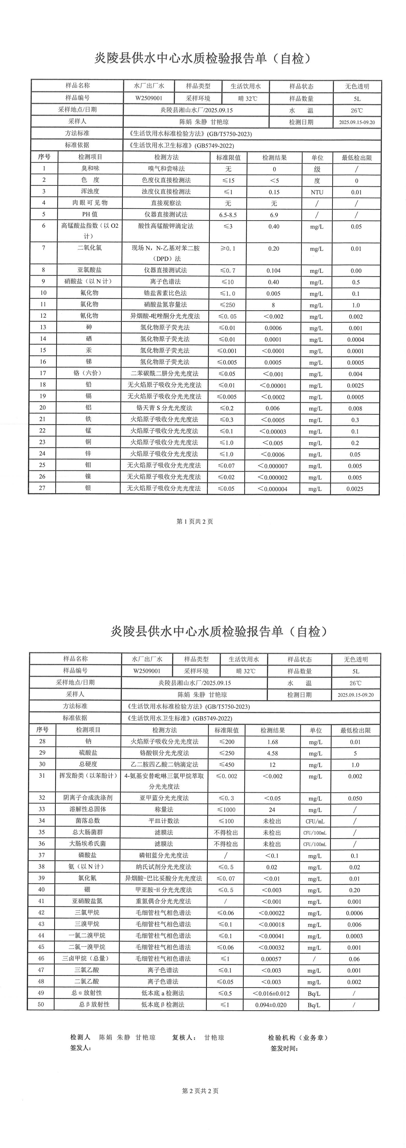 2025年9月份炎陵县自来水供水中心水质检验报告单(自检)