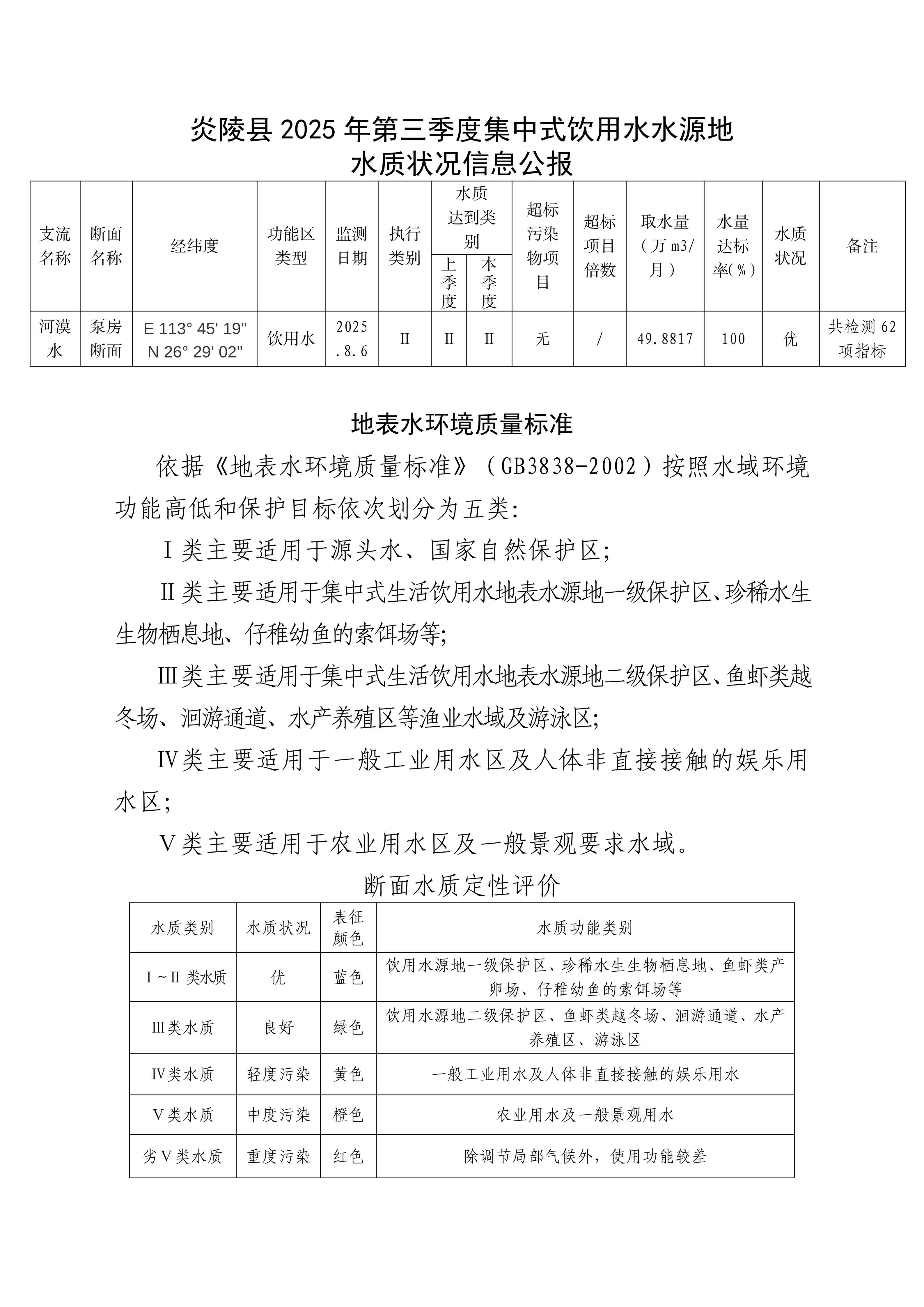 附件:炎陵县2025年第三季度集中式饮用水水源地水质状况信息公报