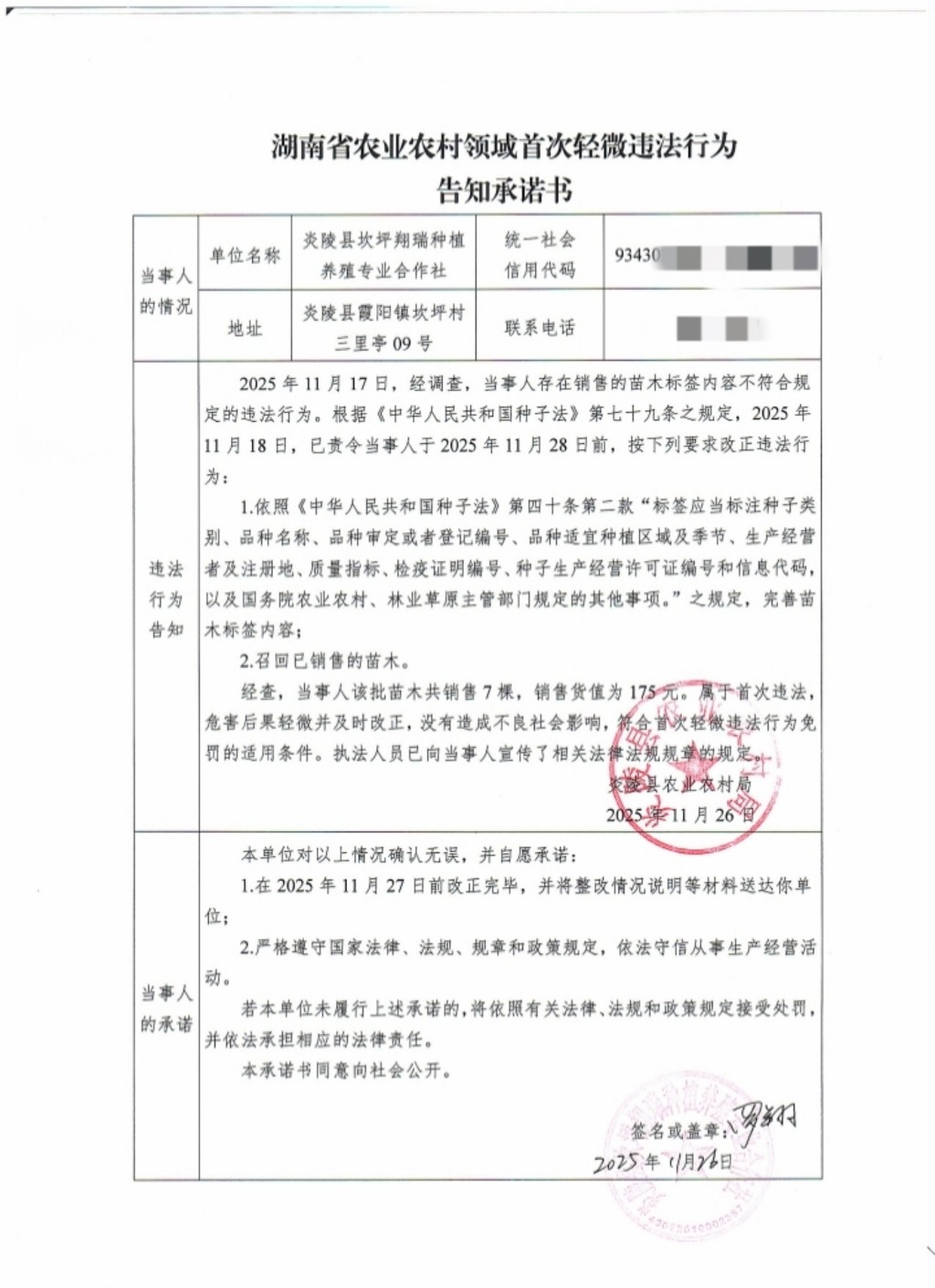湖南省农业农村领域首次轻微违法行为告知承诺书