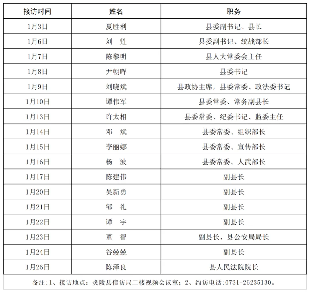 关于2025年1月份炎陵县级领导公开接访群众的安排公告