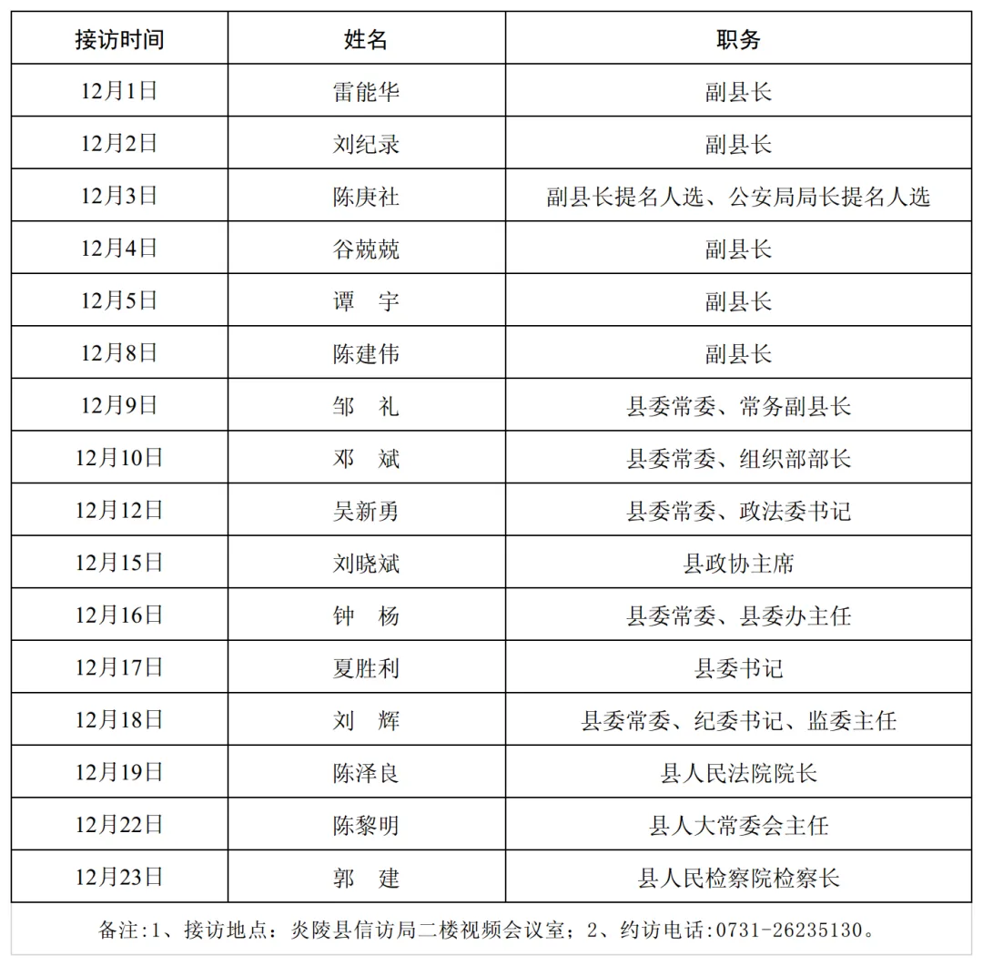 关于2025年12月份炎陵县级领导公开接访群众的安排公告