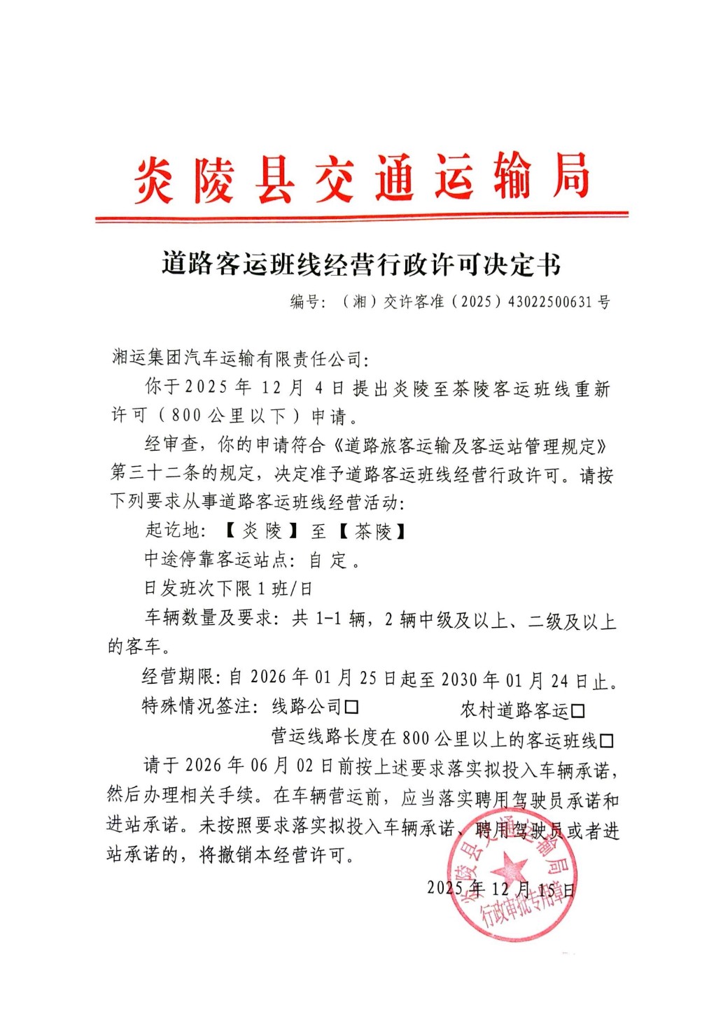 炎陵县交通运输局道路客运班线经营行政许可决定书(湘)交许客准〔2025〕43022500631号