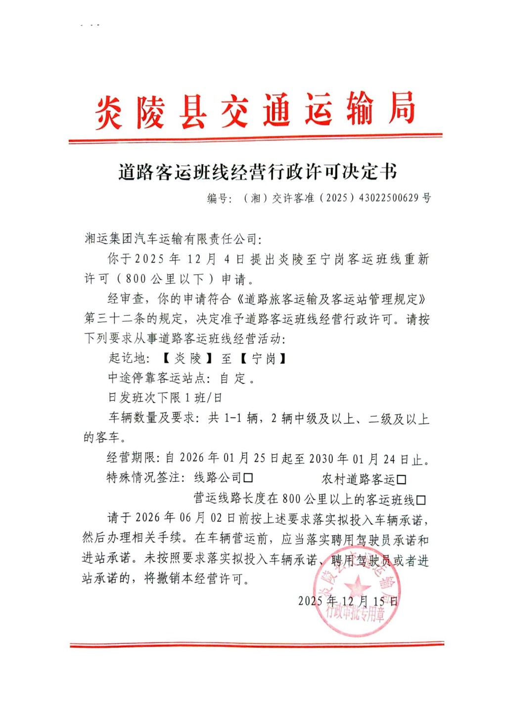 炎陵县交通运输局道路客运班线经营行政许可决定书(湘)交许客准〔2025〕43022500629号