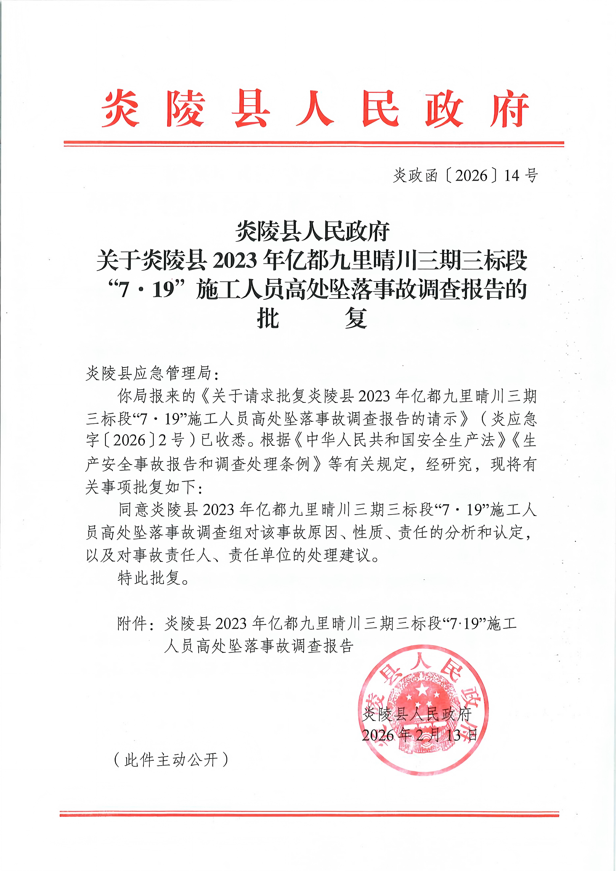 关于炎陵县2023年亿都九里晴川三期三标段“7·19”施工人员高处坠落事故调查报告的批复
