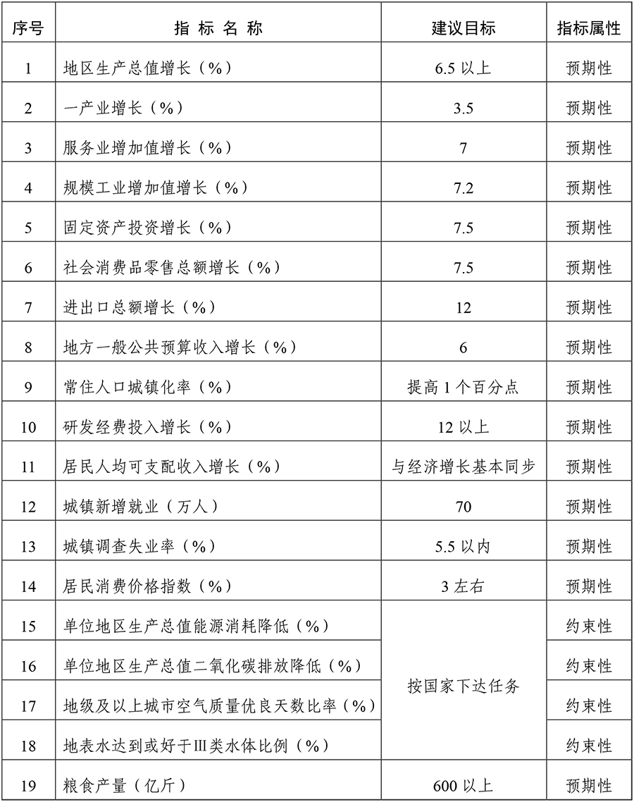按照省委经济工作会议总体部署,2022年经济社会发展主要预期目标是:地区生产总值增长6.5%以上,规模工业增加值增长7.2%,固定资产投资增长7.5%,社会消费品零售总额增长7.5%,进出口增长12%,地方一般公共预算收入增长6%,居民消费价格涨幅3%左右,城镇新增就业70万人,城镇调查失业率5.5%以内,居民收入增长与经济增长基本同步,粮食产量600亿斤以上,生态环境指标稳步改善。