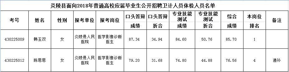 《炎陵县面向2018年普通高校应届毕业生公开招聘卫计人员公告》规定,根据应聘同一岗位考生综合成绩从高到低,按招聘岗位计划数1:1的比例等额确定签约对象,签约考生参加体检。具体体检人员名单详见附表。