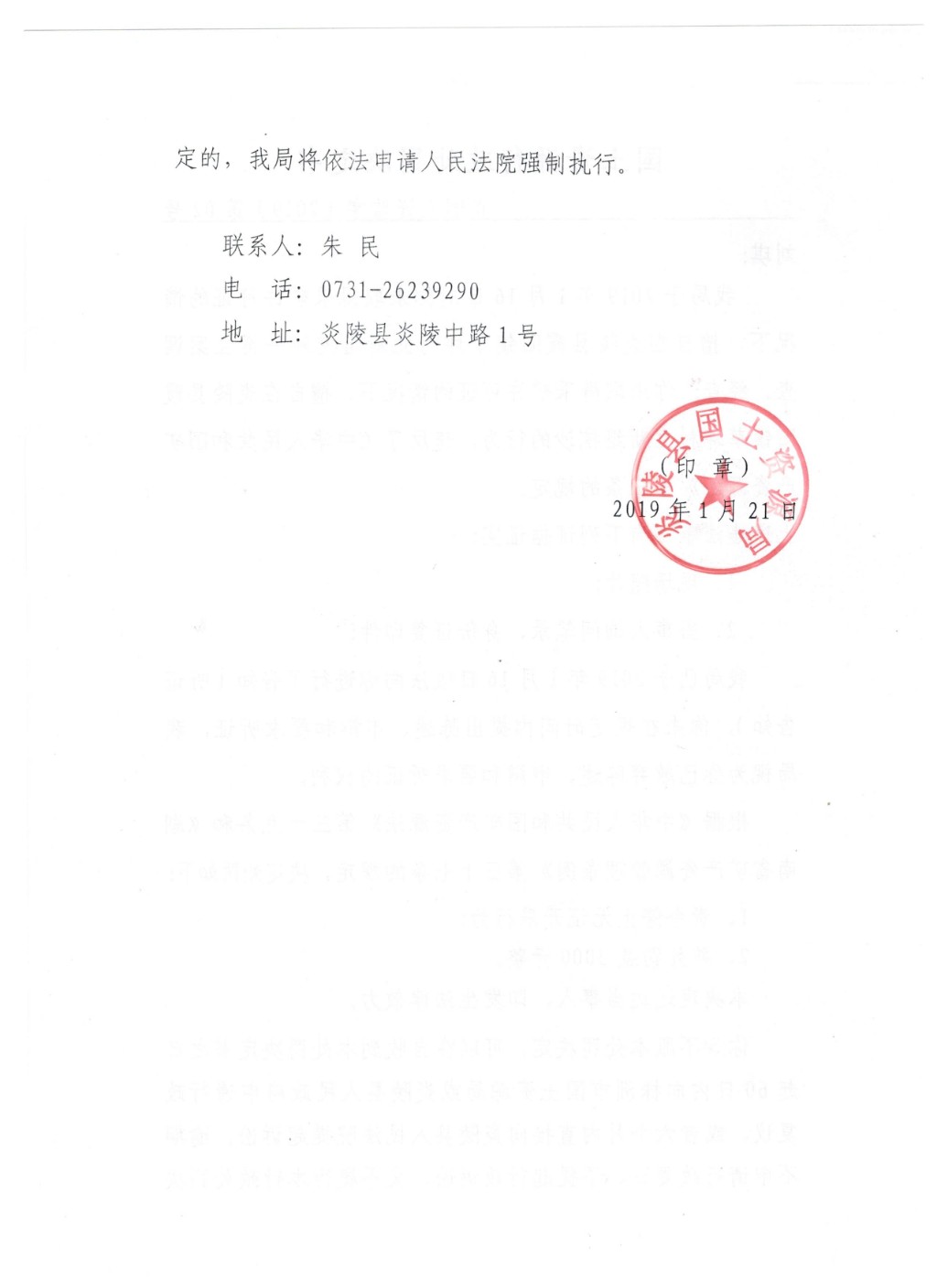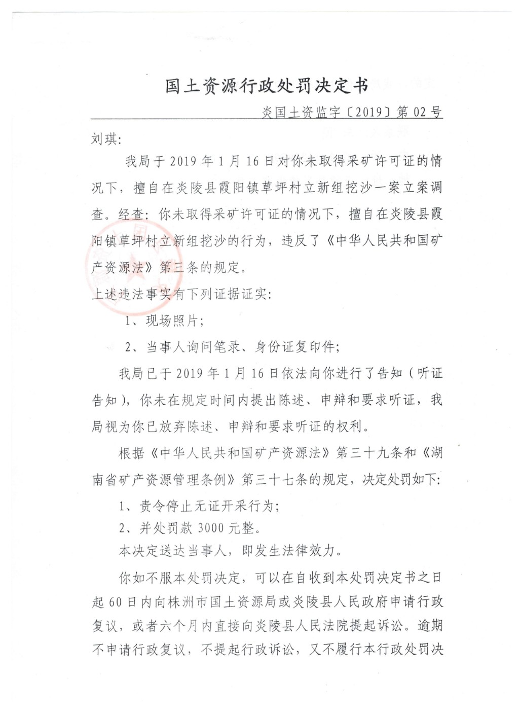 炎陵县国土资源局炎国土资监字【2019】第02号行政处罚决定书