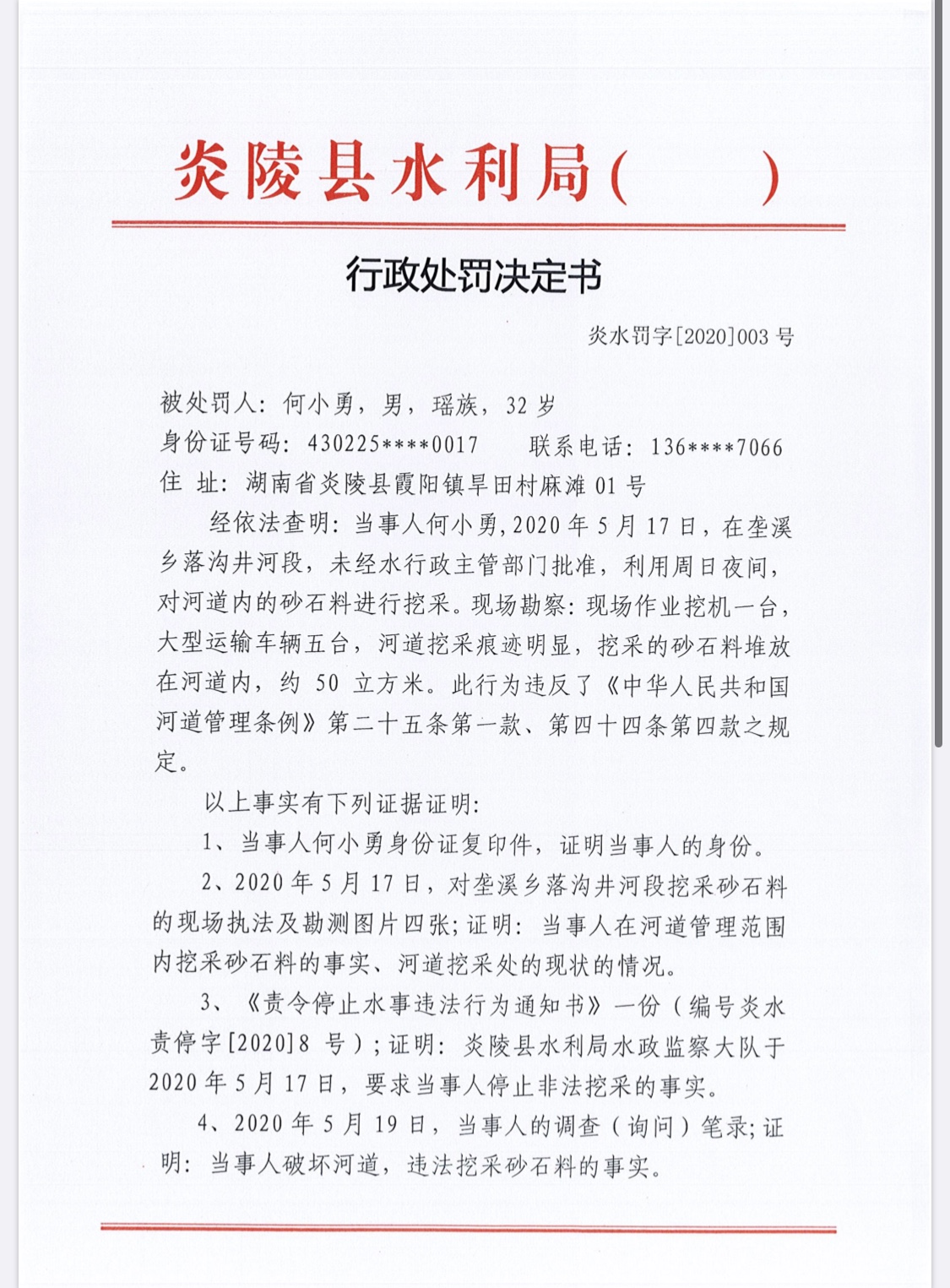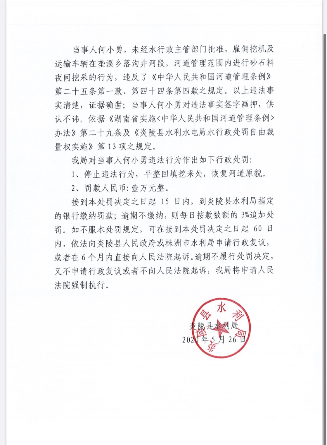 炎陵县水利局行政处罚决定书炎水罚字[2020]003号