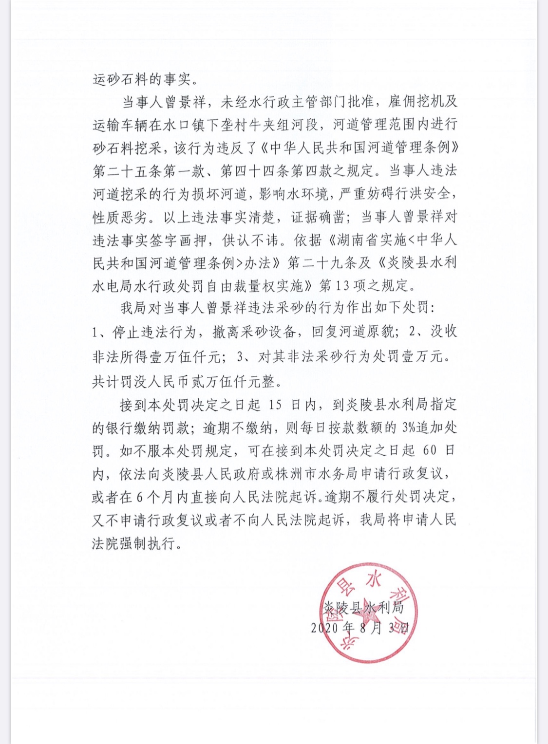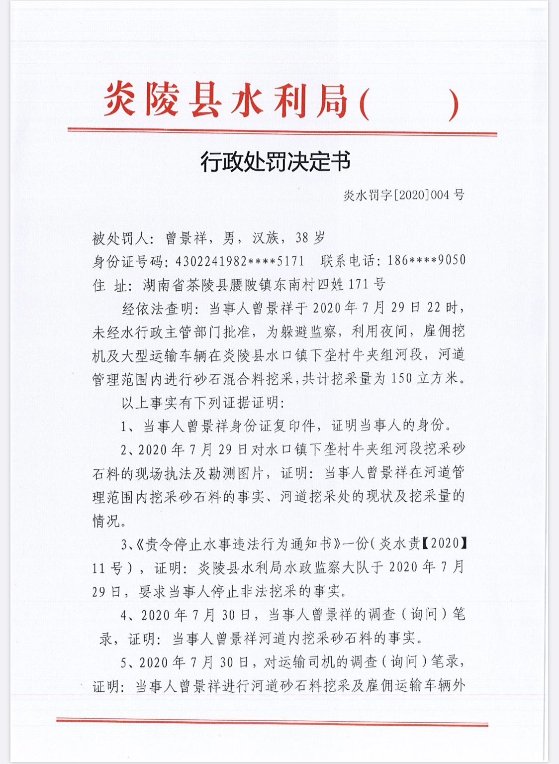 炎陵县水利局行政处罚决定书炎水罚字[2020]004号