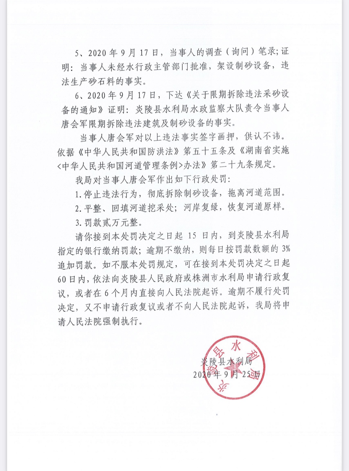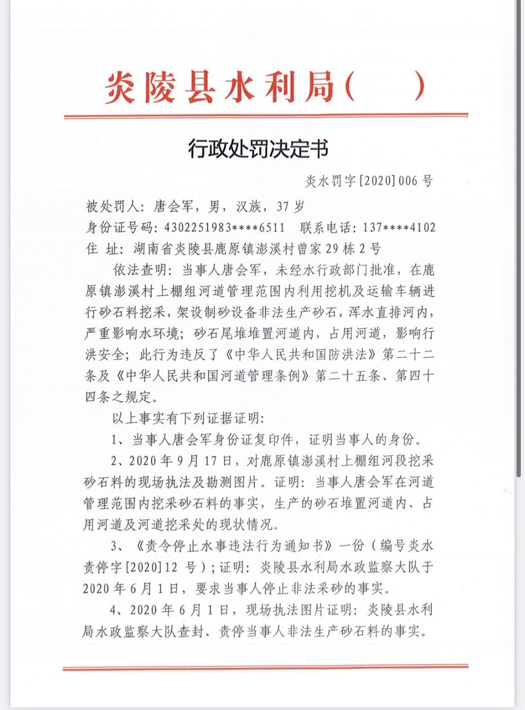炎陵县水利局行政处罚决定书炎水罚字[2020]006号