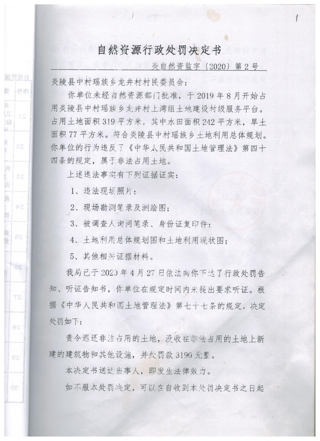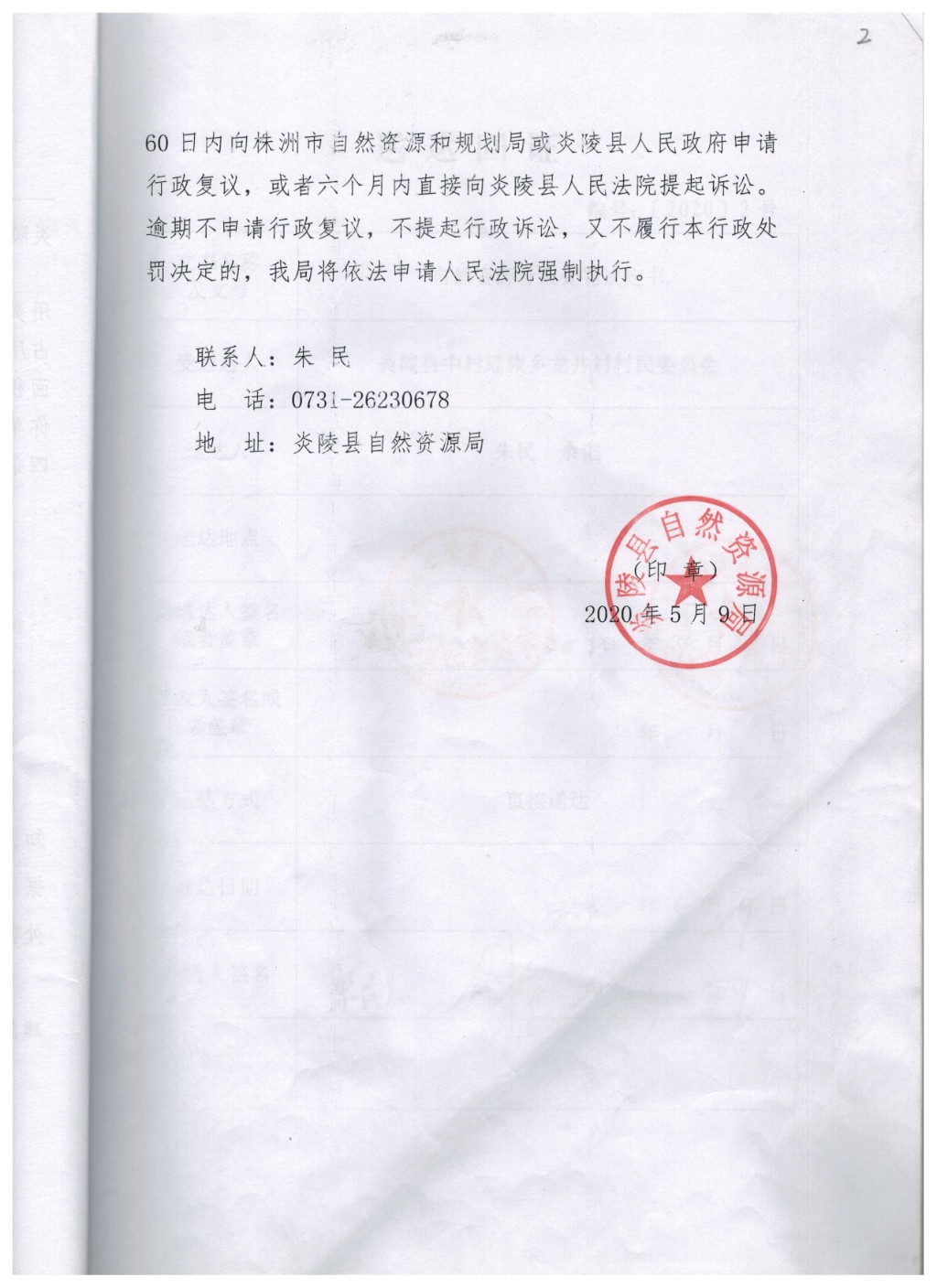 炎陵县自然资源局行政处罚决定书炎自然资监字〔2020〕第2号
