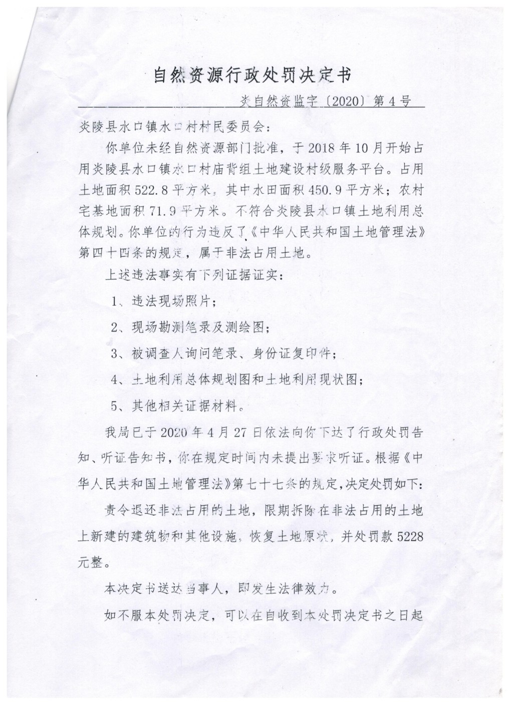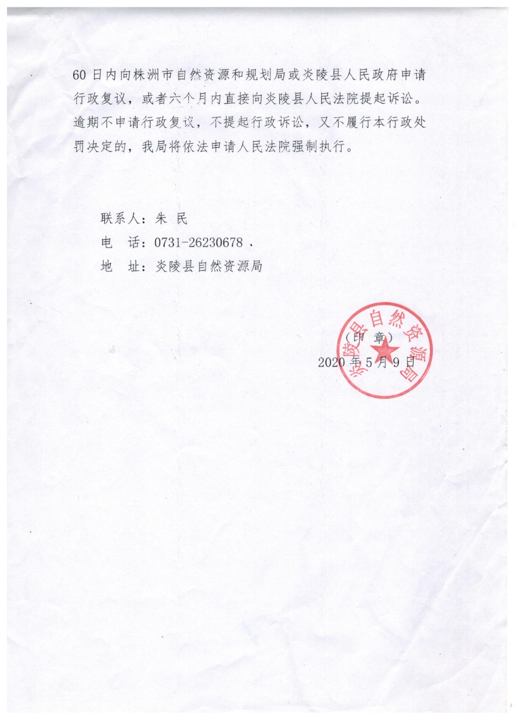 炎陵县自然资源局行政处罚决定书炎自然资监字〔2020〕第4号