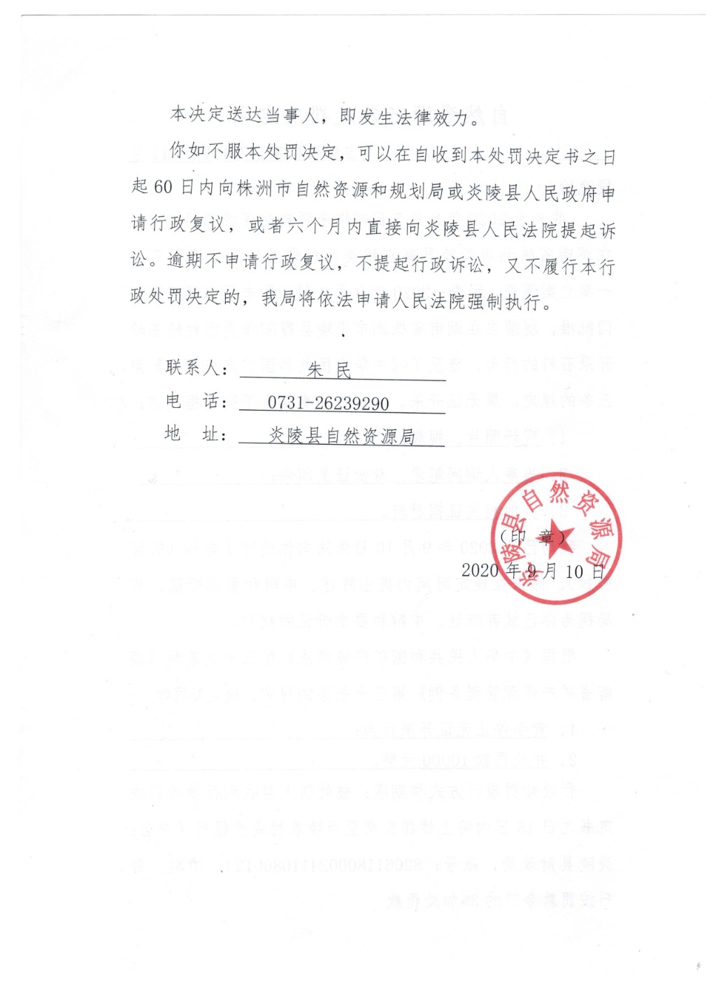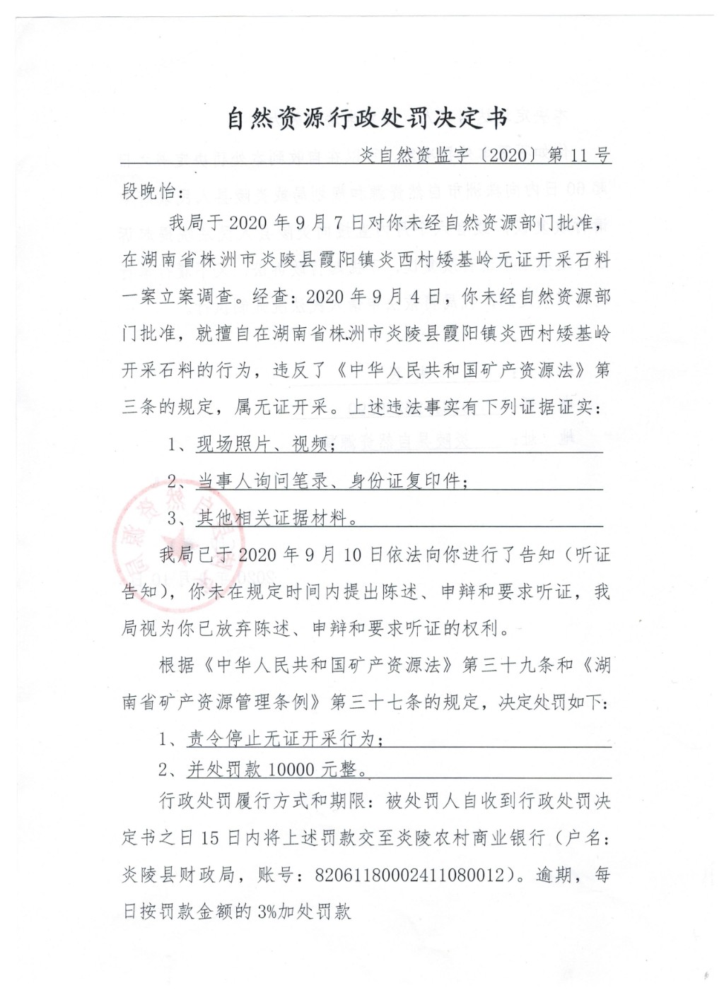 炎陵县自然资源局行政处罚决定书炎自然资监字〔2020〕第11号