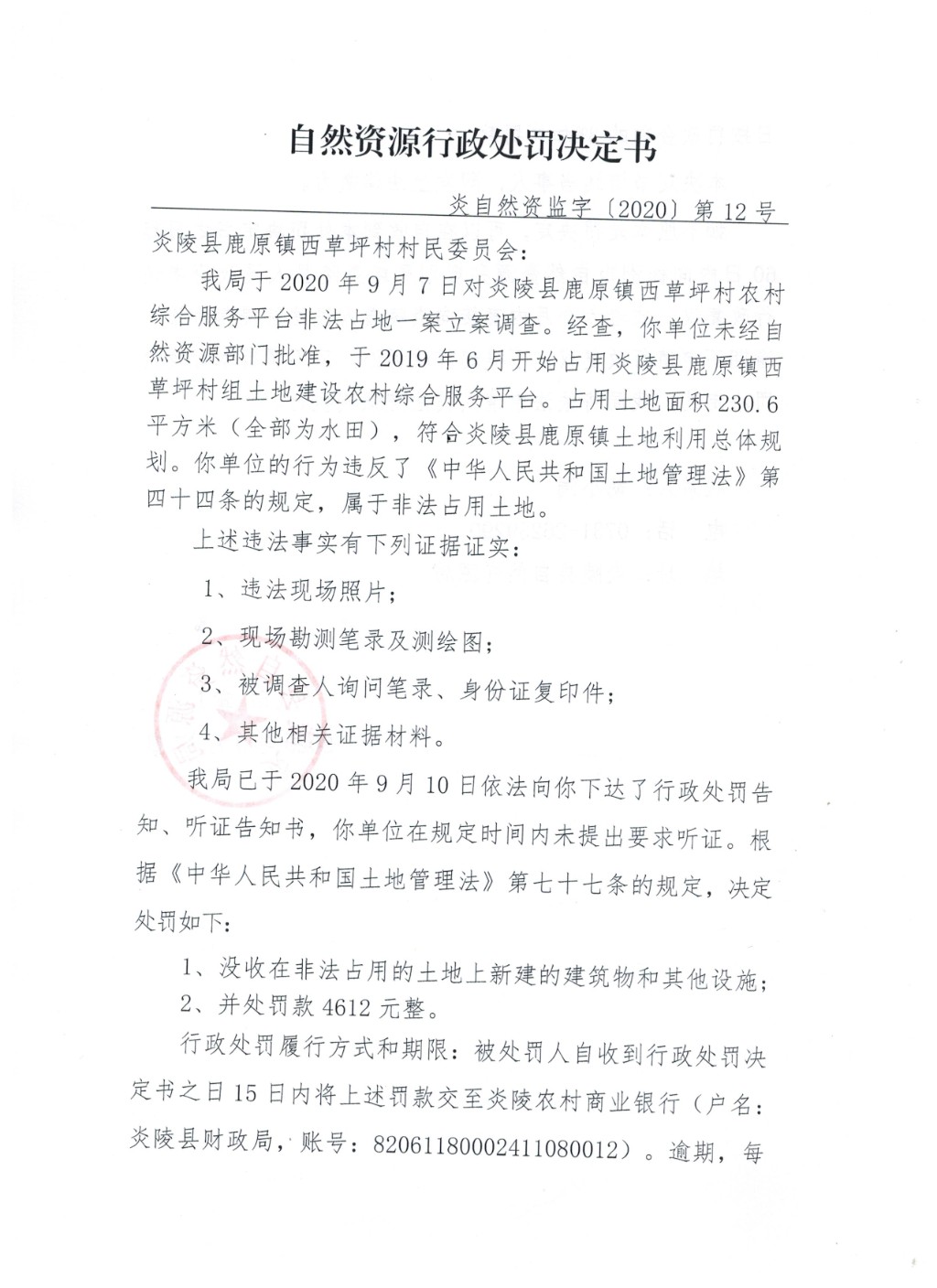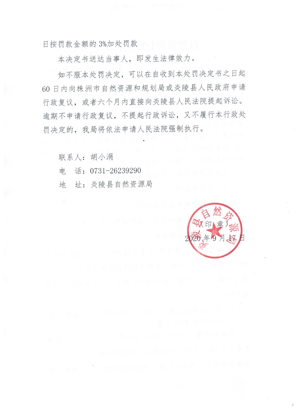 炎陵县自然资源局行政处罚决定书炎自然资监字〔2020〕第12号