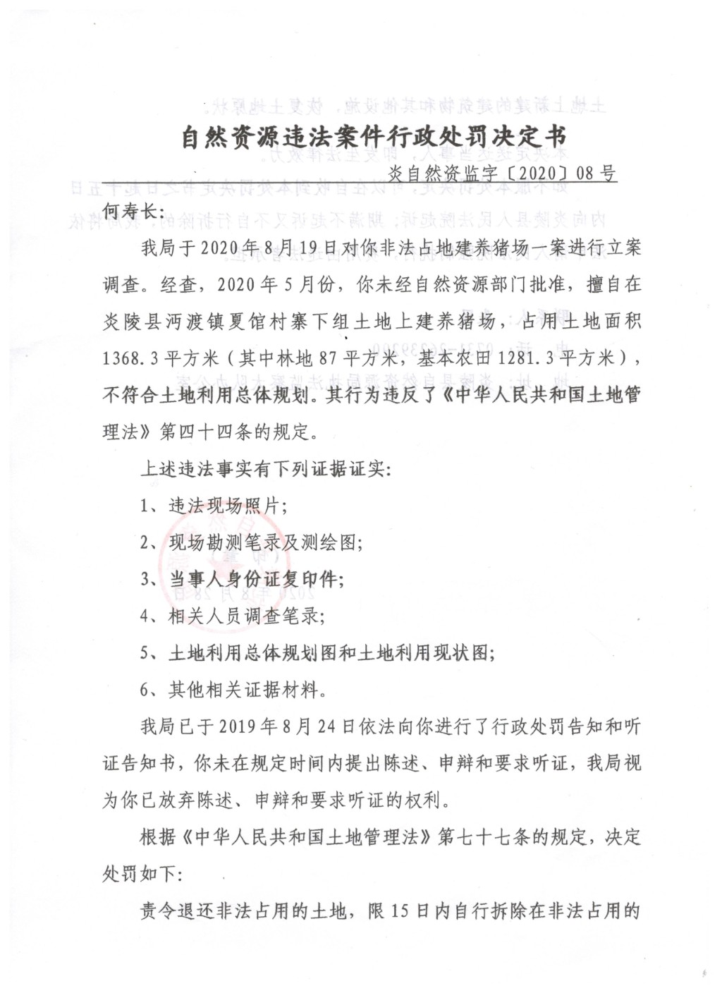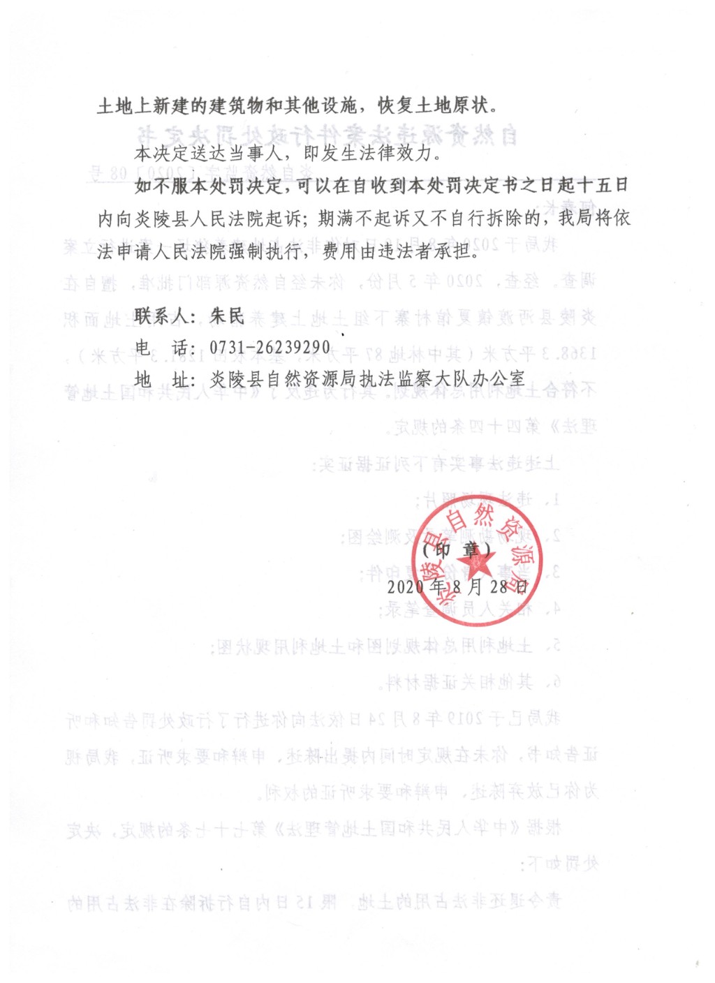 炎陵县自然资源局行政处罚决定书炎自然资监字〔2020〕第8号