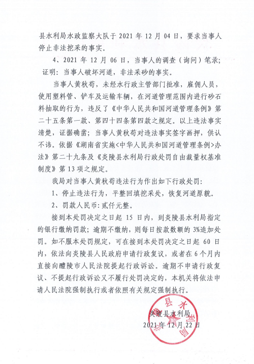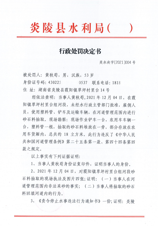 炎陵县水利局行政处罚决定书炎水决字[2021]004号