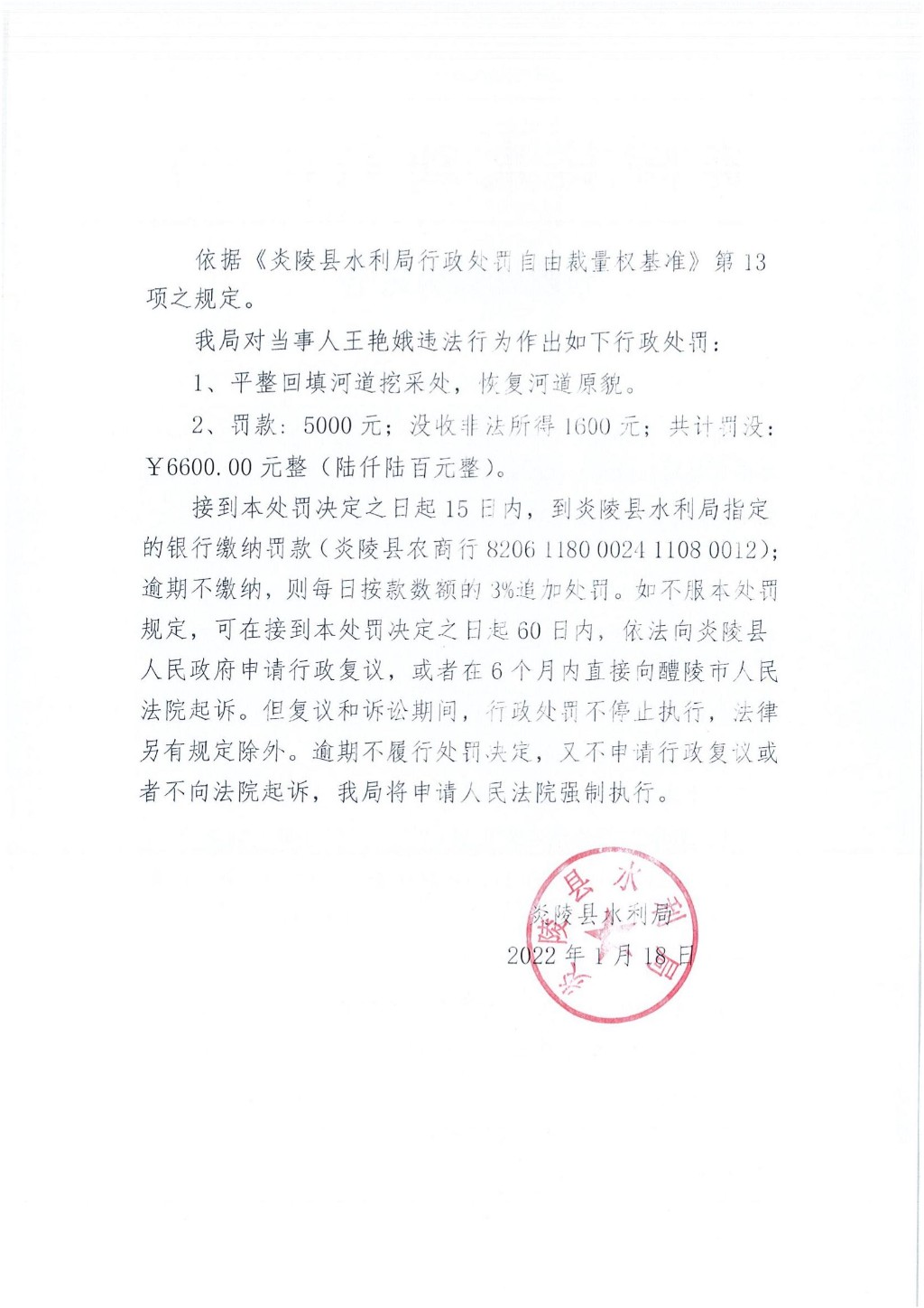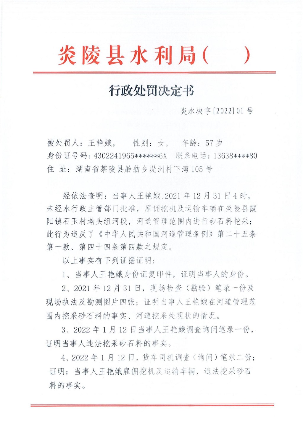 炎陵县水利局行政处罚决定书炎水决字[2022]01号