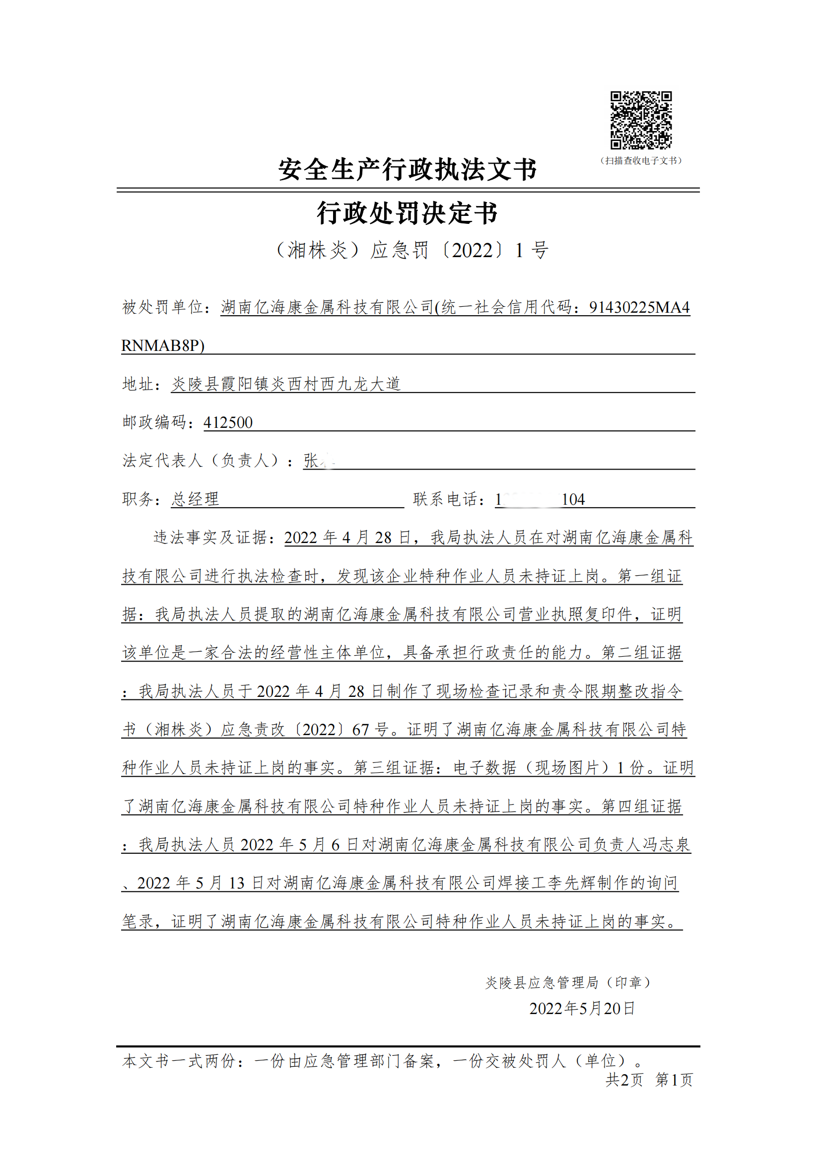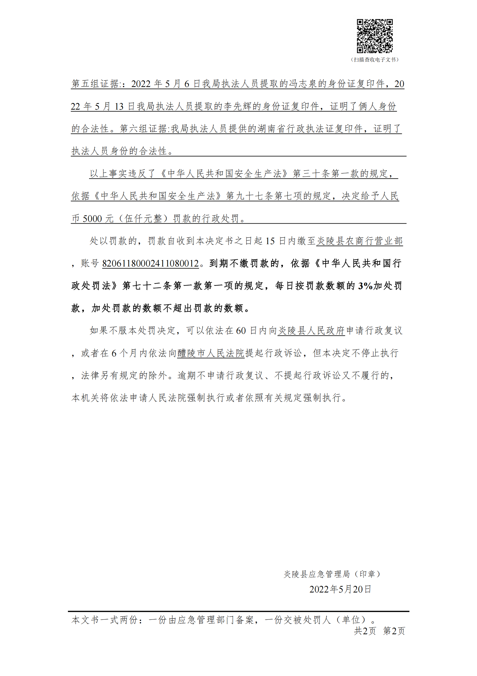炎陵县应急管理局行政处罚决定书(湘株炎)应急罚〔2022〕1号