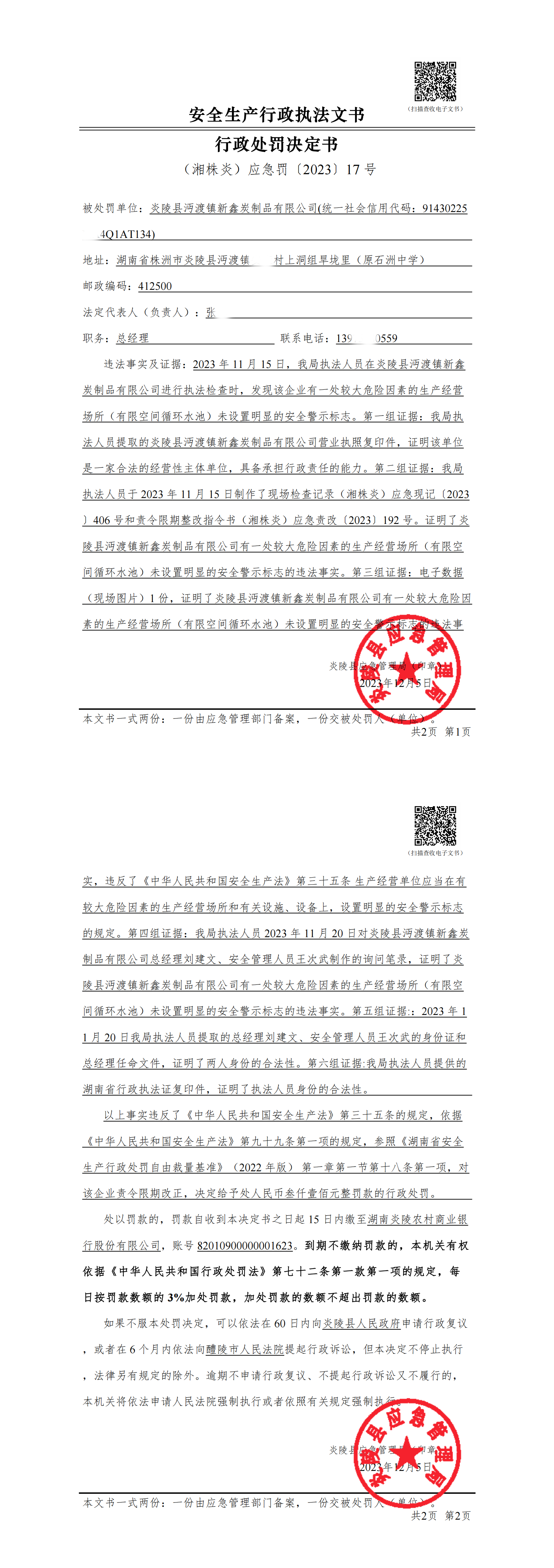 炎陵县应急管理局行政处罚决定书(湘株炎)应急罚〔2023〕17 号