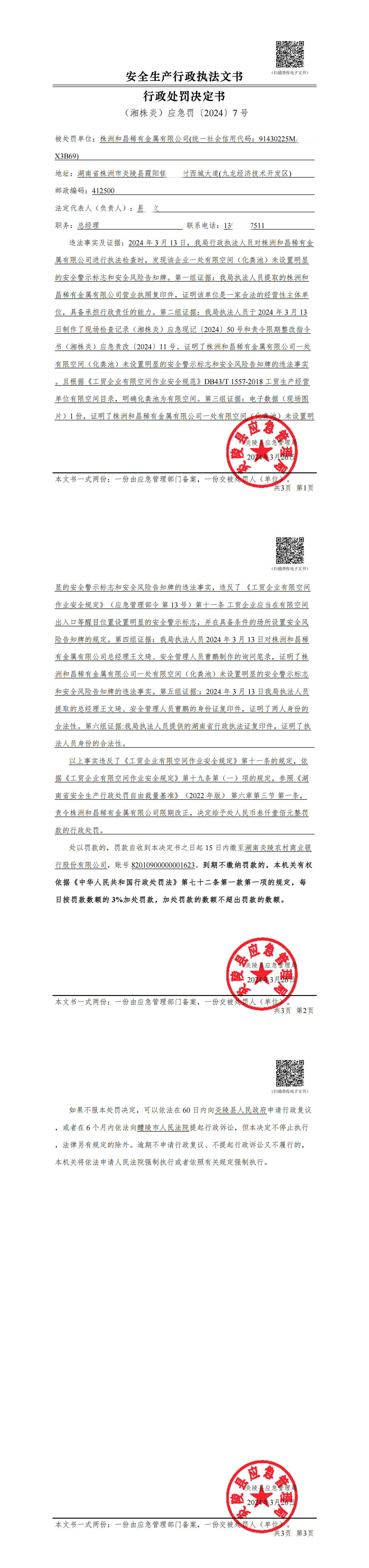 炎陵县应急管理局行政处罚决定书(湘株炎)应急罚〔2024〕7号