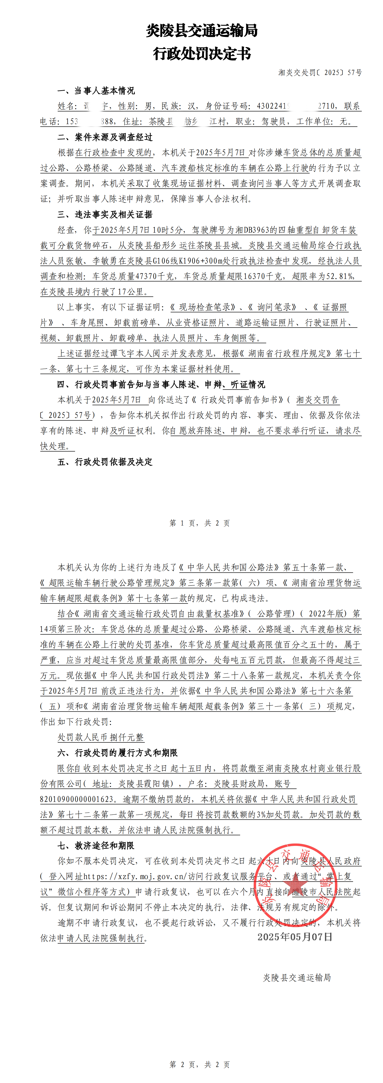 炎陵县交通运输局行政处罚决定书湘炎交处罚〔2025〕57号
