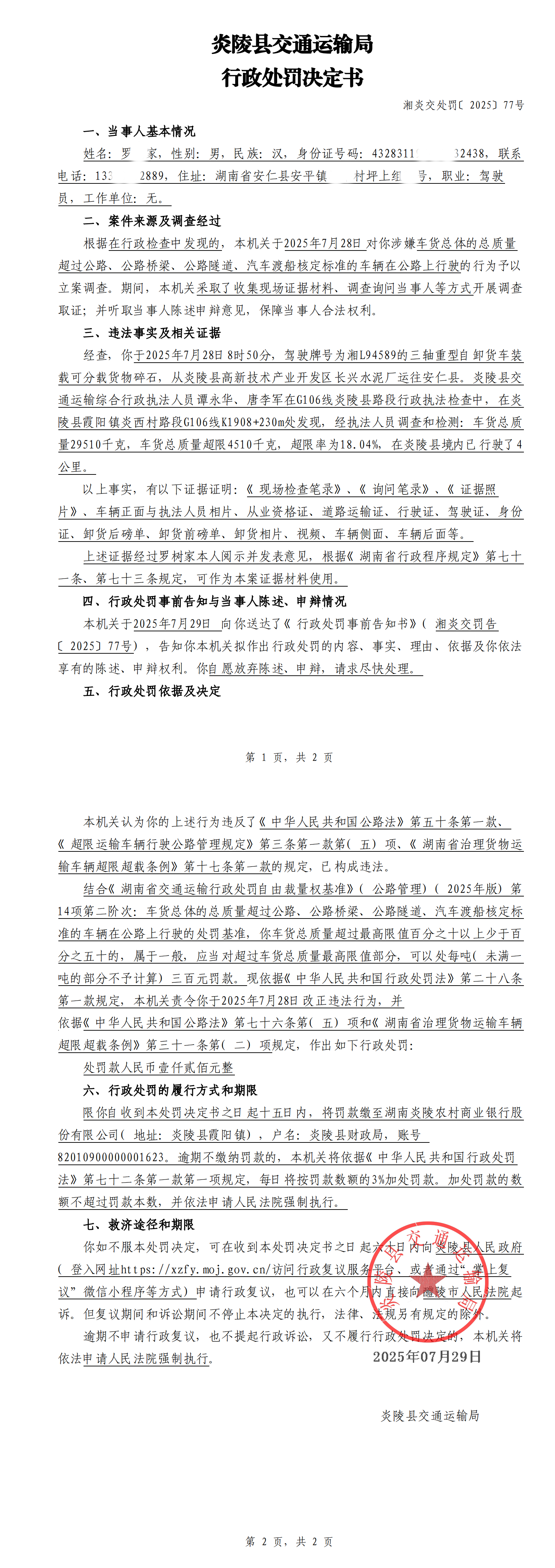 炎陵县交通运输局行政处罚决定书湘炎交处罚〔2025〕77号