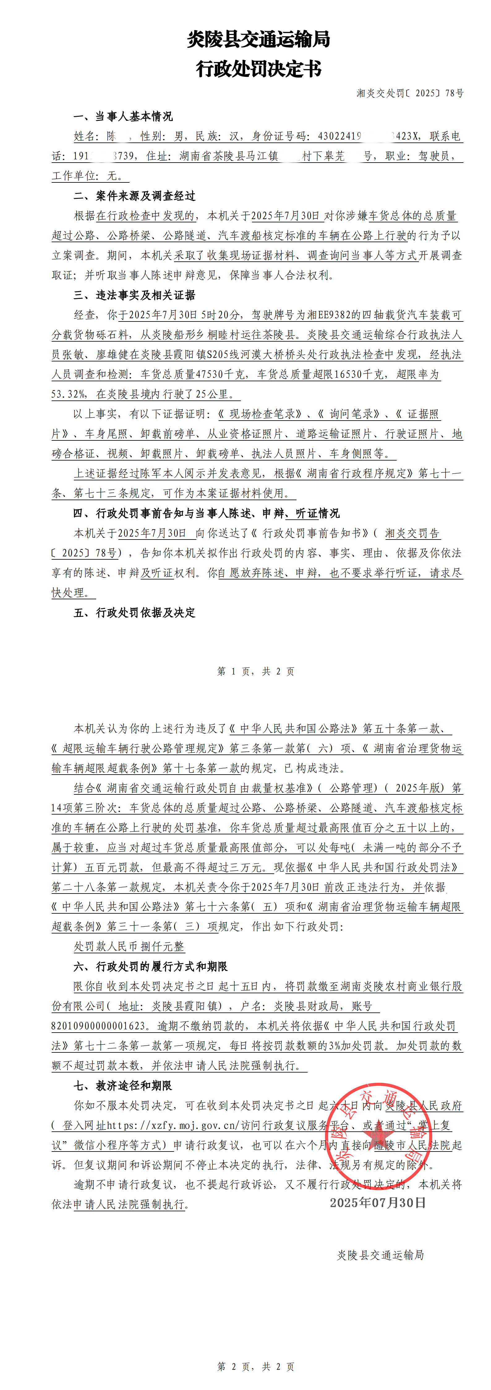 炎陵县交通运输局行政处罚决定书湘炎交处罚〔2025〕78号