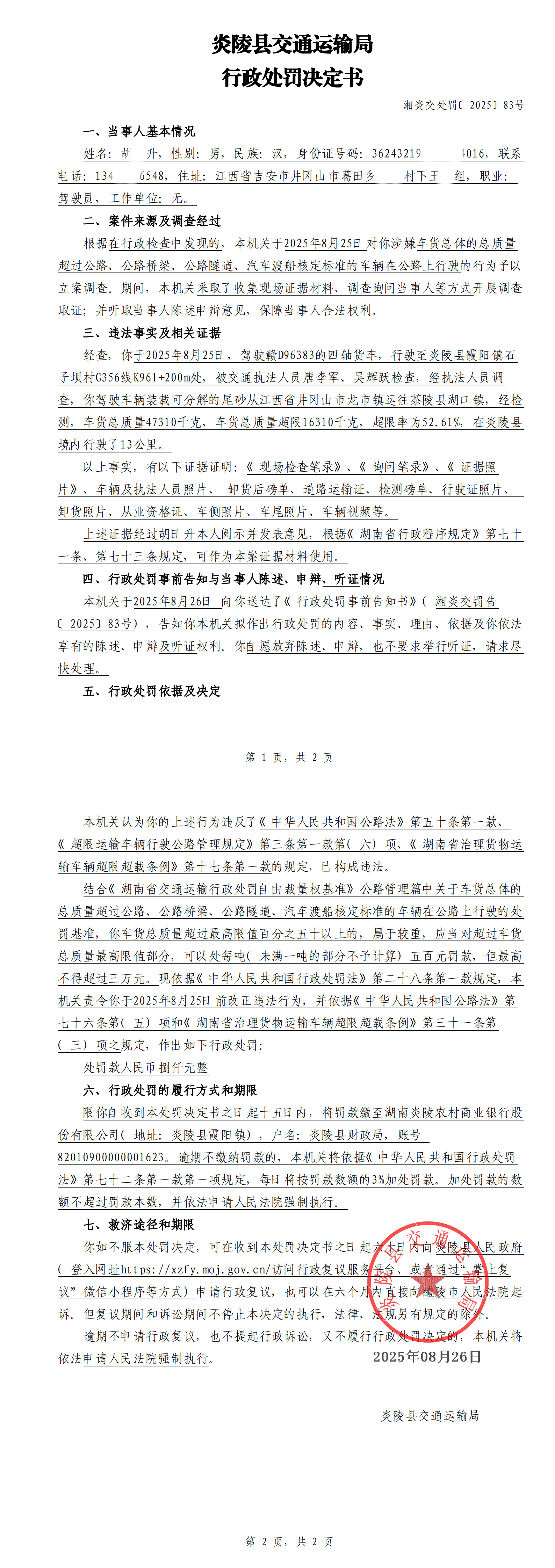 炎陵县交通运输局行政处罚决定书湘炎交处罚〔2025〕83号