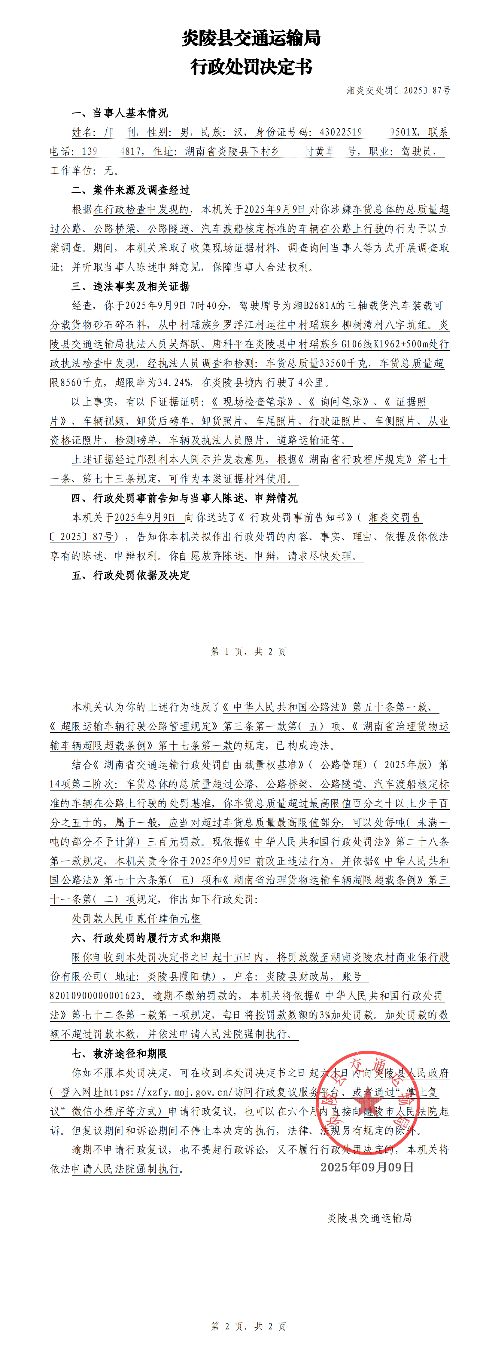 炎陵县交通运输局行政处罚决定书湘炎交处罚〔2025〕87号