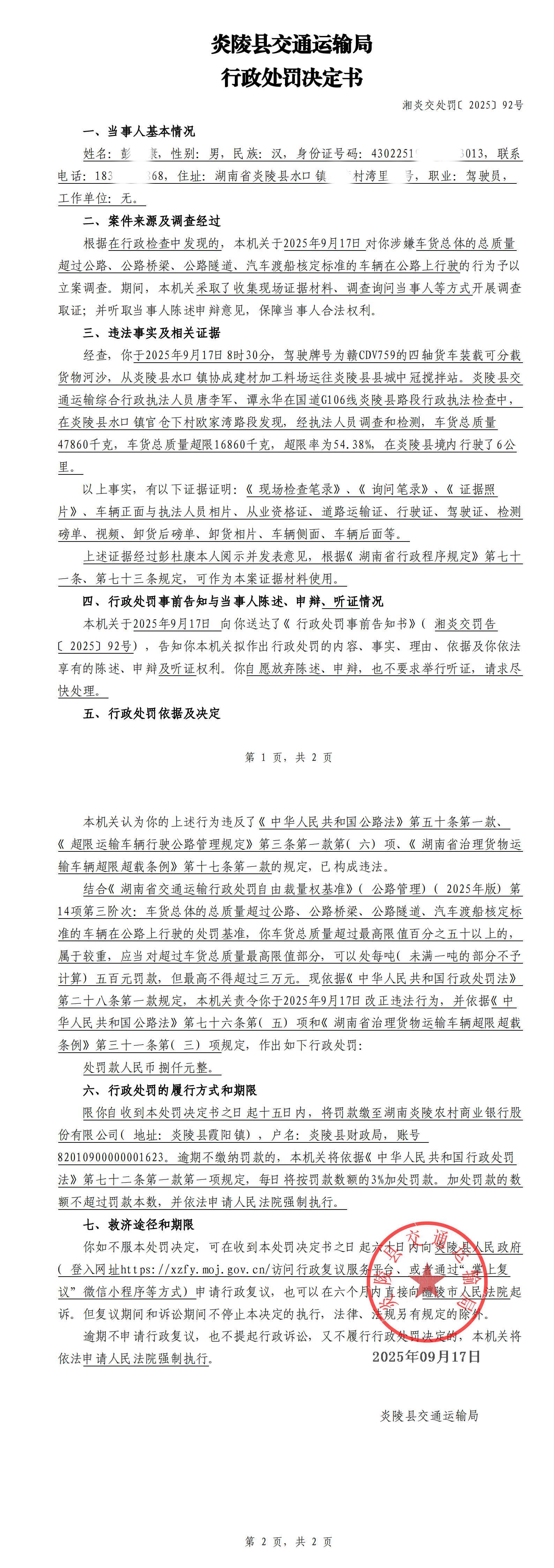 炎陵县交通运输局行政处罚决定书湘炎交处罚〔2025〕92号