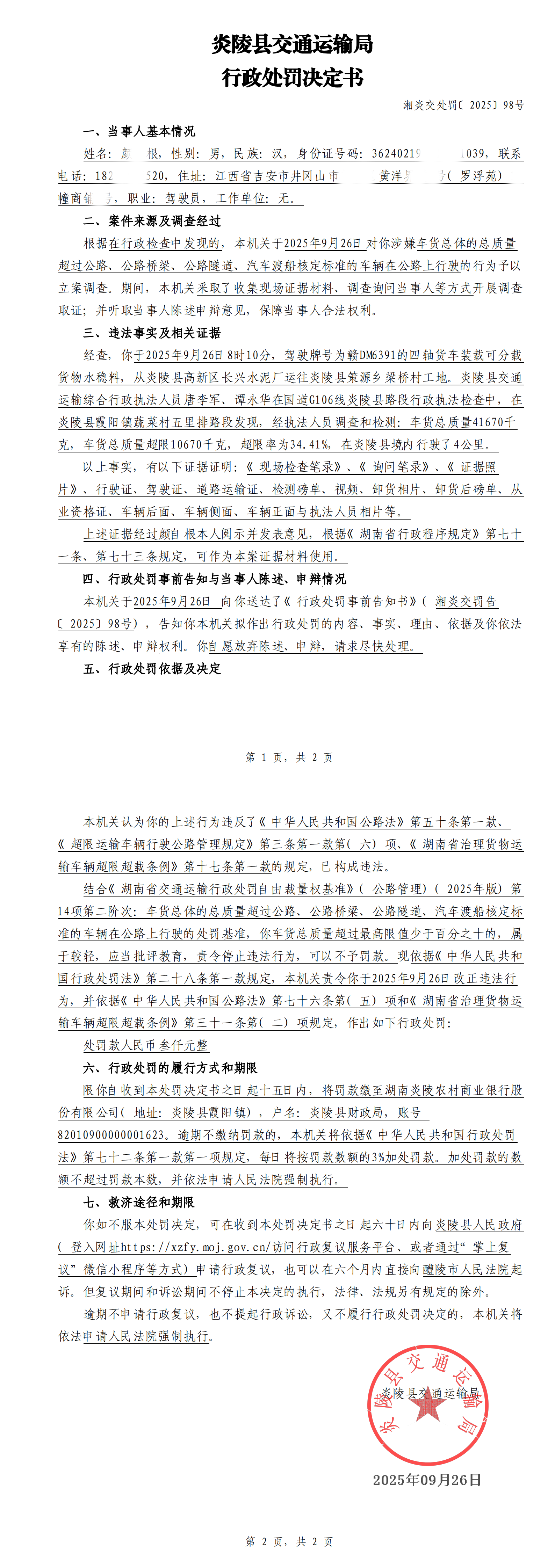 炎陵县交通运输局行政处罚决定书湘炎交处罚〔2025〕98号