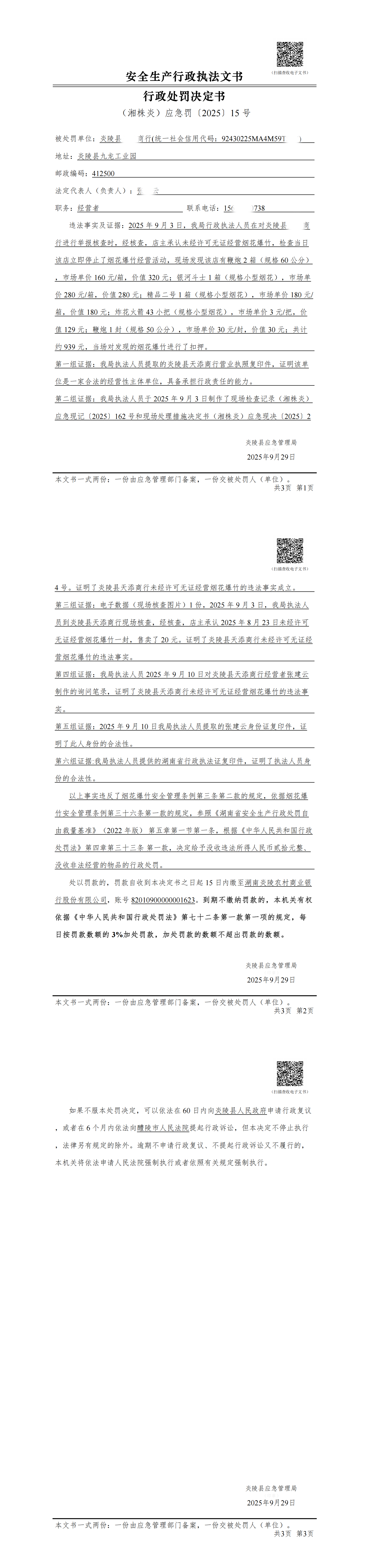 炎陵县应急管理局行政处罚决定书(湘株炎)应急罚〔2025〕15号