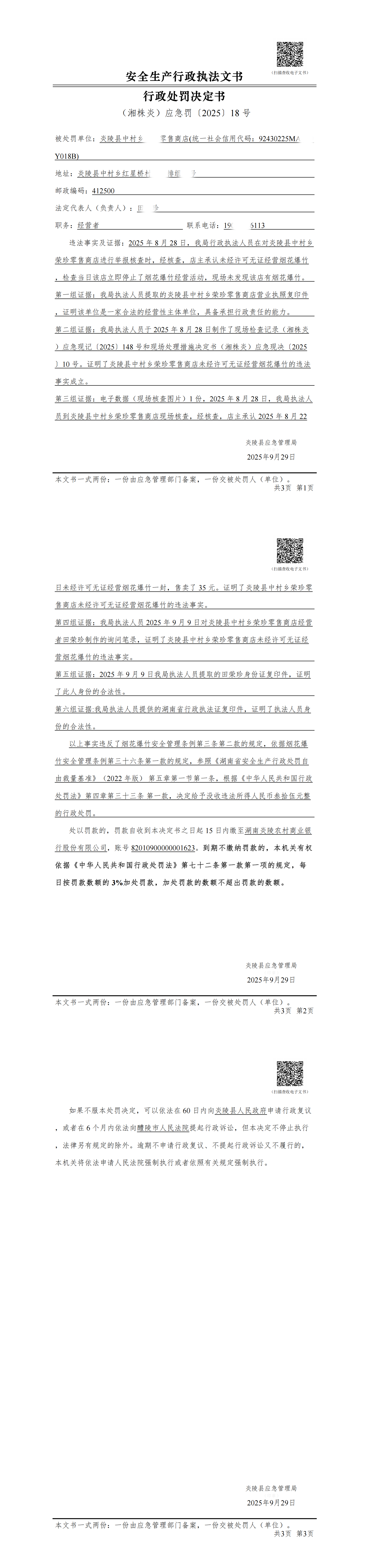 炎陵县应急管理局行政处罚决定书(湘株炎)应急罚〔2025〕18号