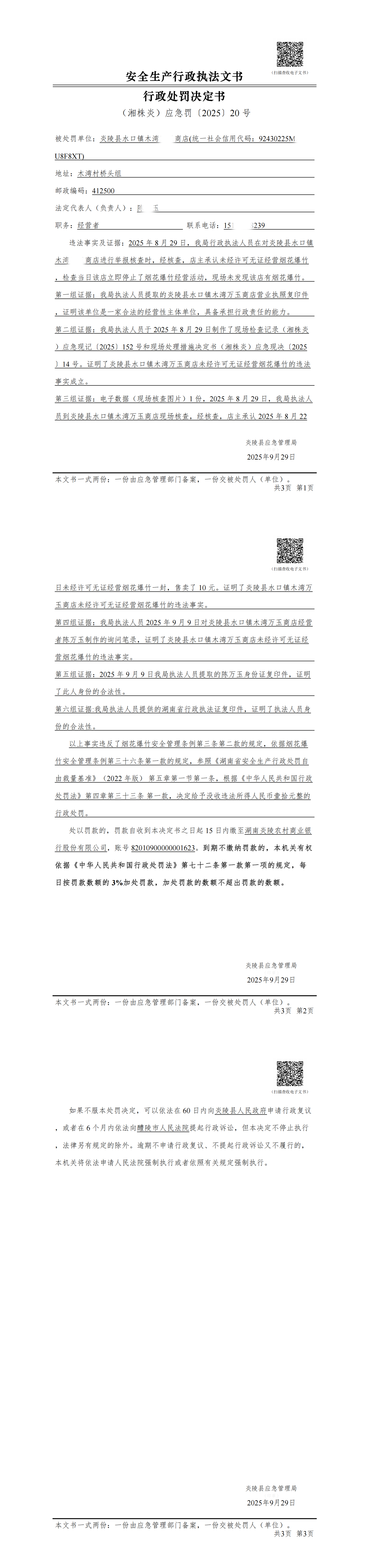 炎陵县应急管理局行政处罚决定书(湘株炎)应急罚〔2025〕20号