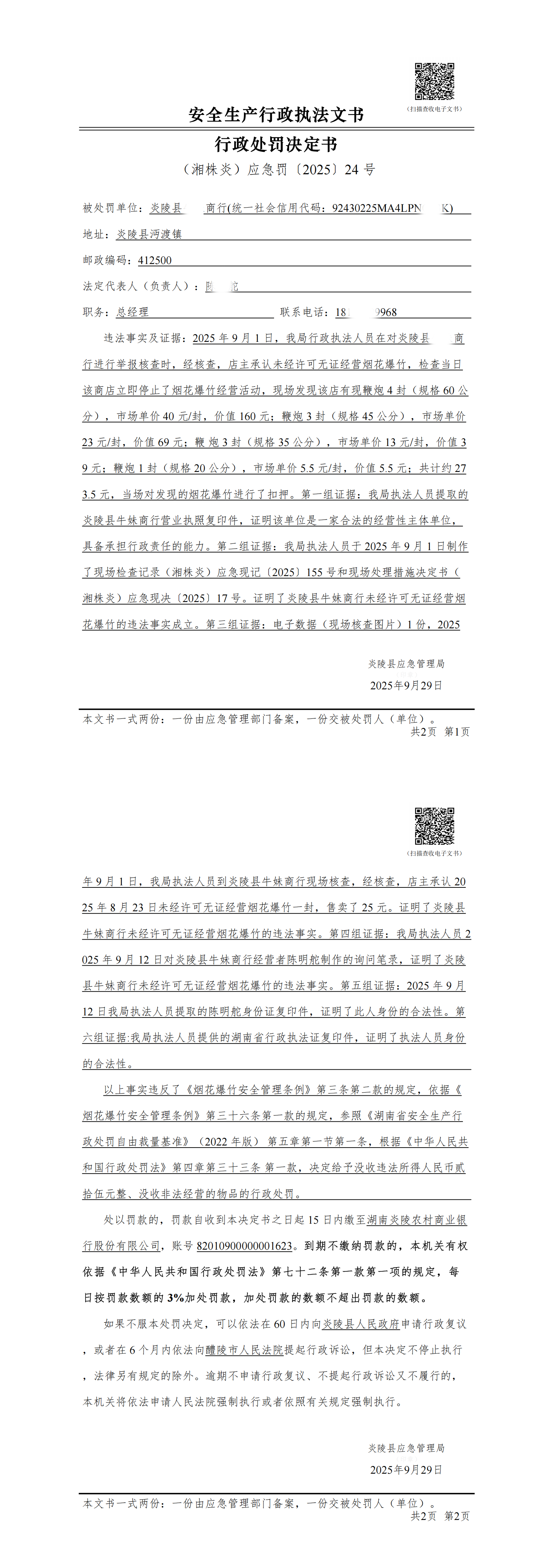 炎陵县应急管理局行政处罚决定书(湘株炎)应急罚〔2025〕24号