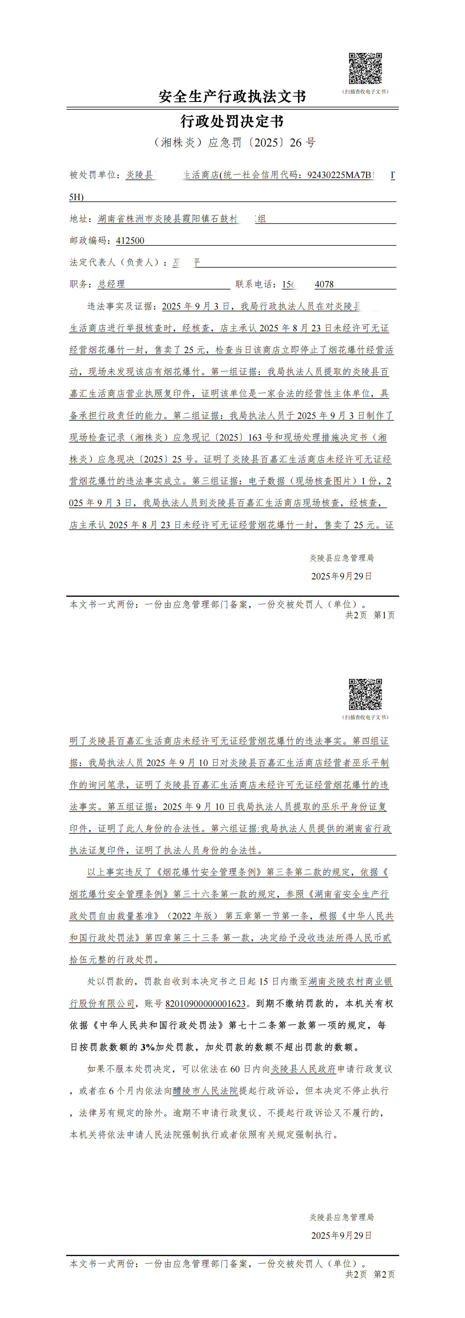 炎陵县应急管理局行政处罚决定书(湘株炎)应急罚〔2025〕26号