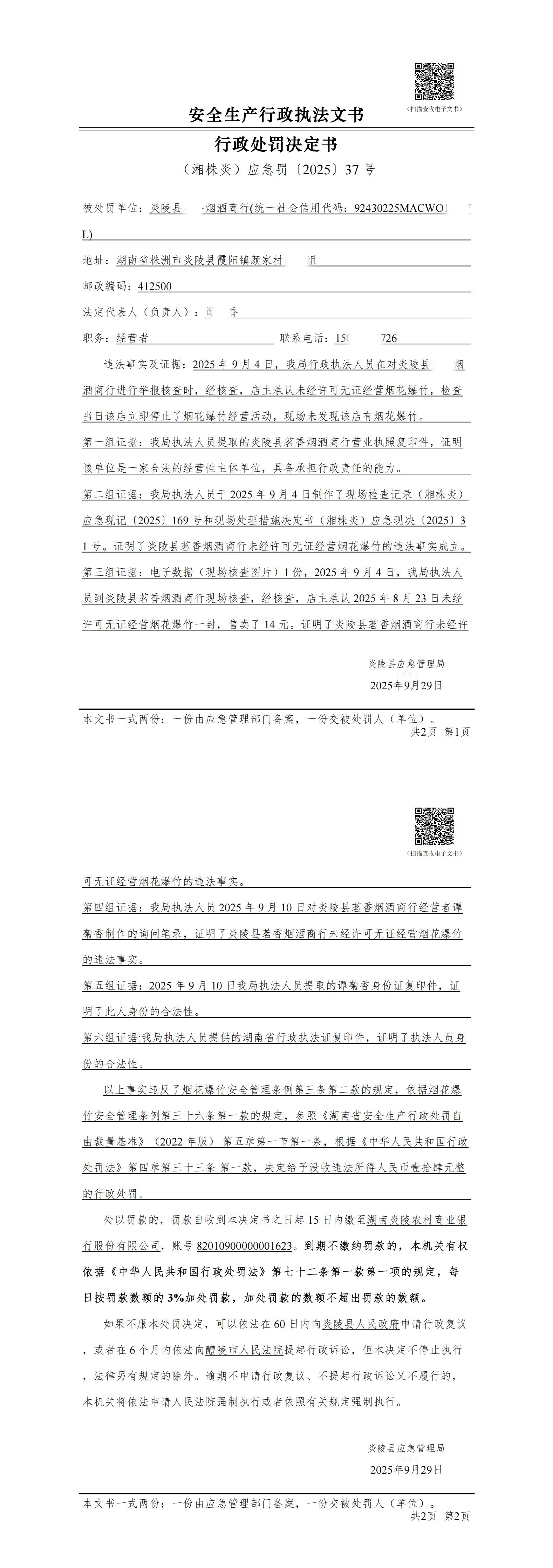 炎陵县应急管理局行政处罚决定书(湘株炎)应急罚〔2025〕37号