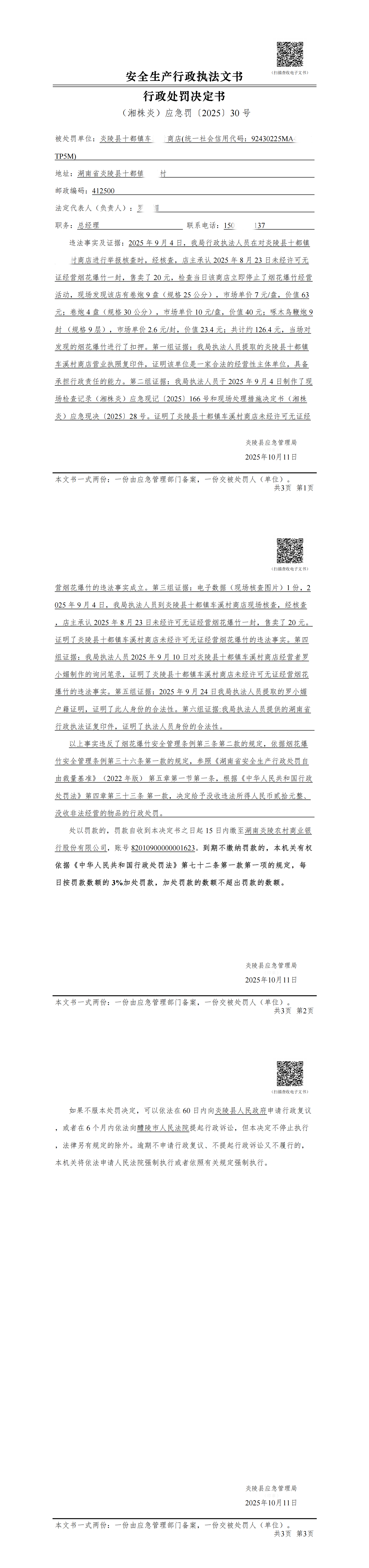 炎陵县应急管理局行政处罚决定书(湘株炎)应急罚〔2025〕30号