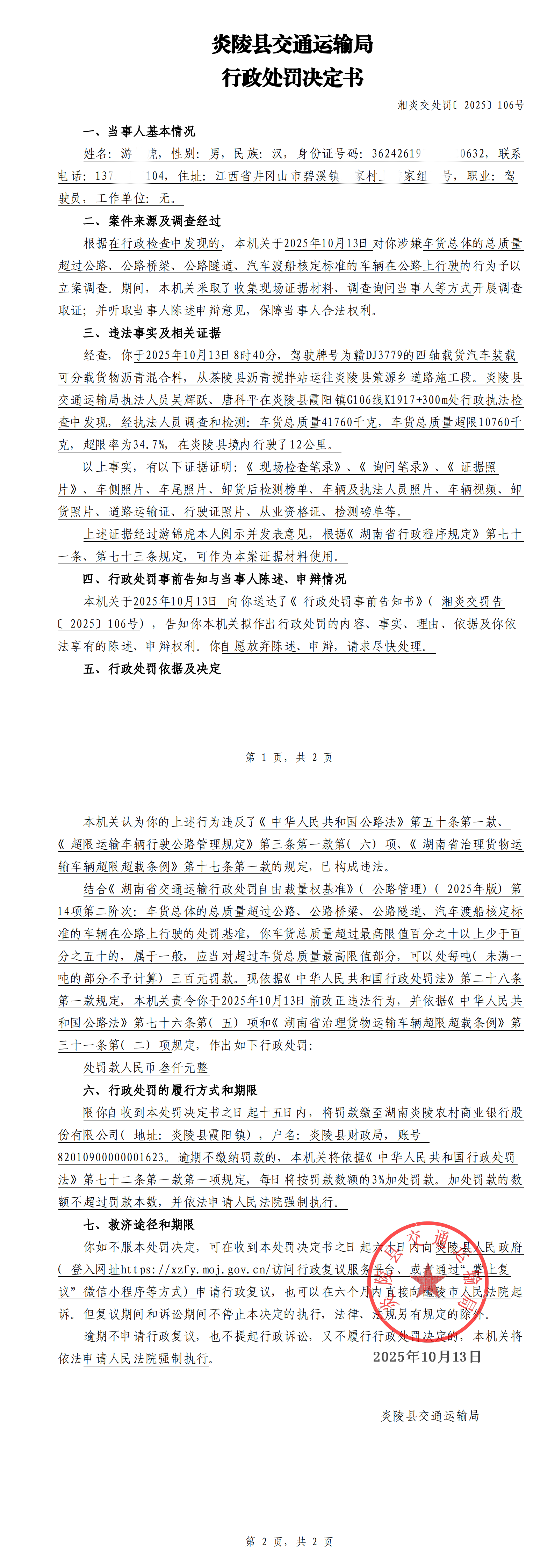 炎陵县交通运输局行政处罚决定书湘炎交处罚〔2025〕106号